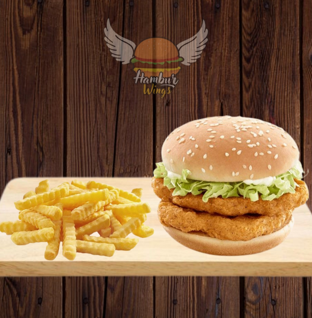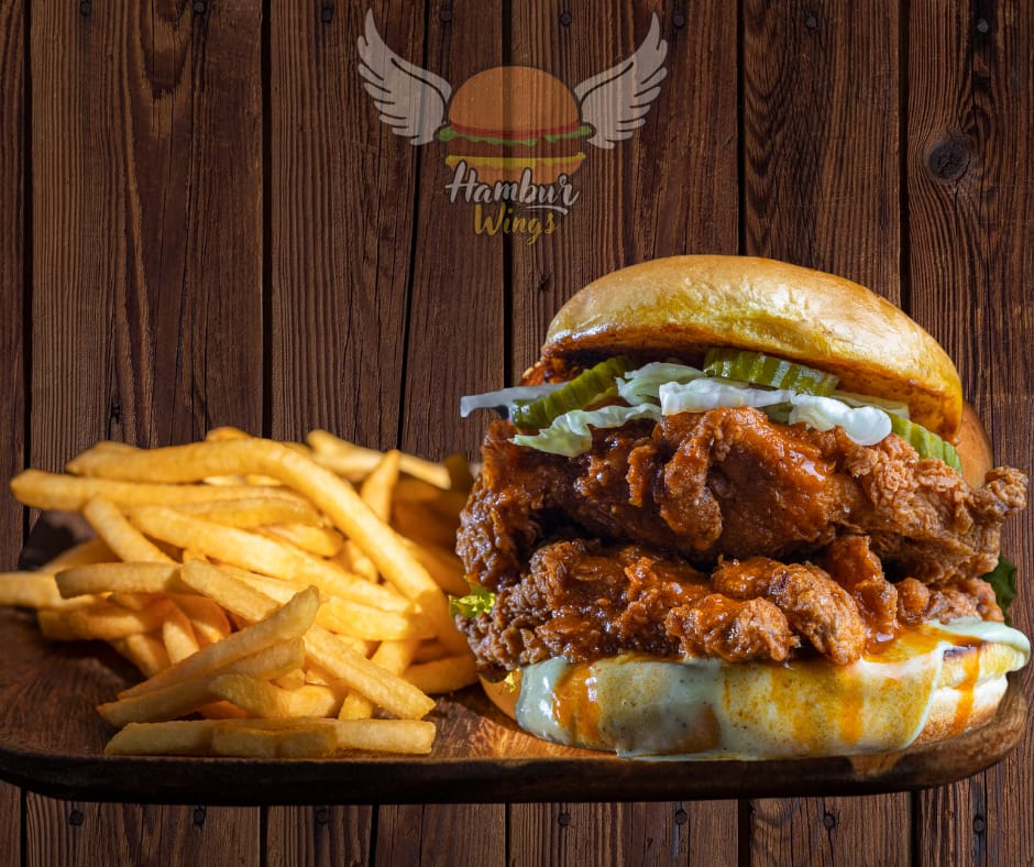 Hamburguesa de boneless (salsa a elegir) mas dos carnes de 140gr cada una a elegir, queso, lechuga, picante y 120gr de papas