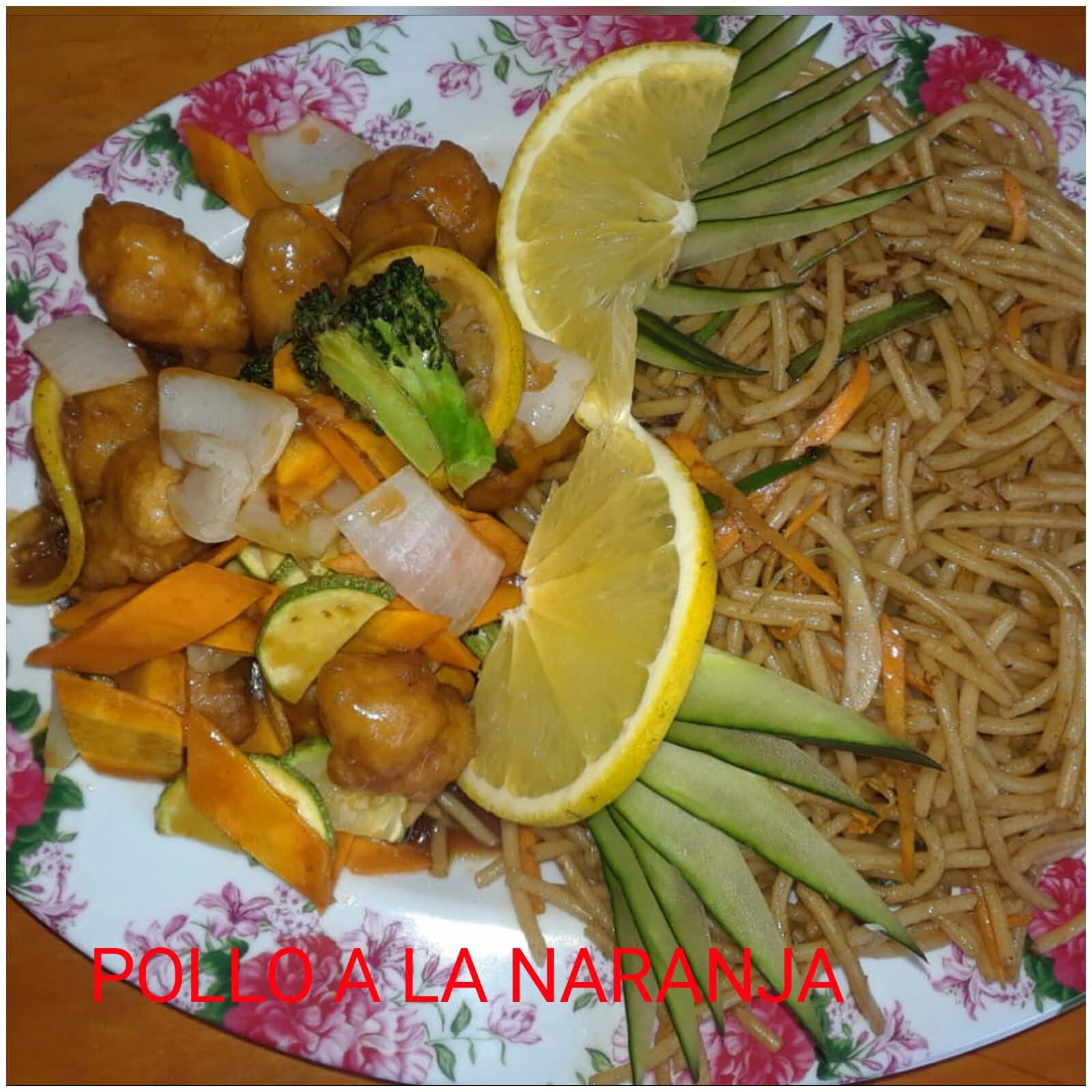 Trozos de pollo capeado o rebozado con brocoli, calabaza, zanahoria y cebolla, bañado en una combinacion de salsa cafe, catsup y salsa de aceite de chile de arbol.