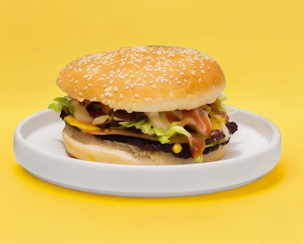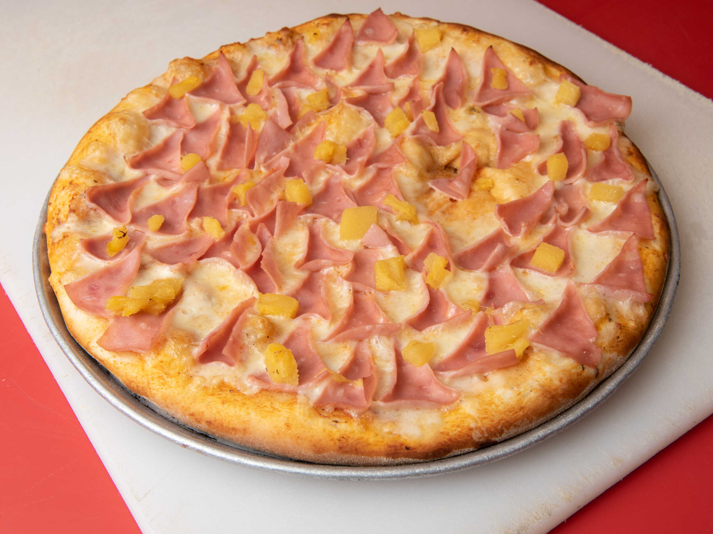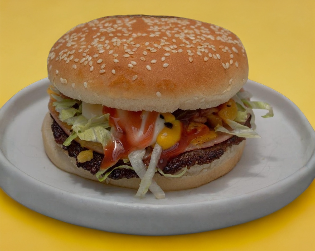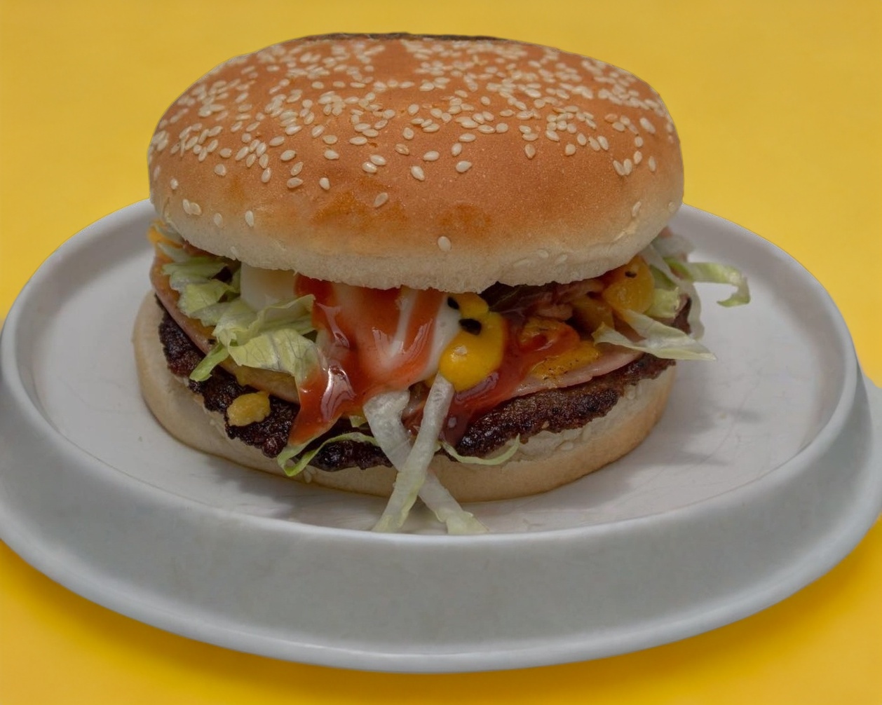 Carne de res, jamón, tocino, queso amarillo, catsup, lechuga, jalapeños , piña , mostaza y aderezo