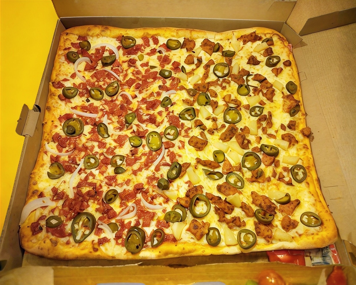 Carne de pollo , jamón, tocino, queso amarillo, catsup, lechuga, jalapeños , piña , mostaza y aderezo