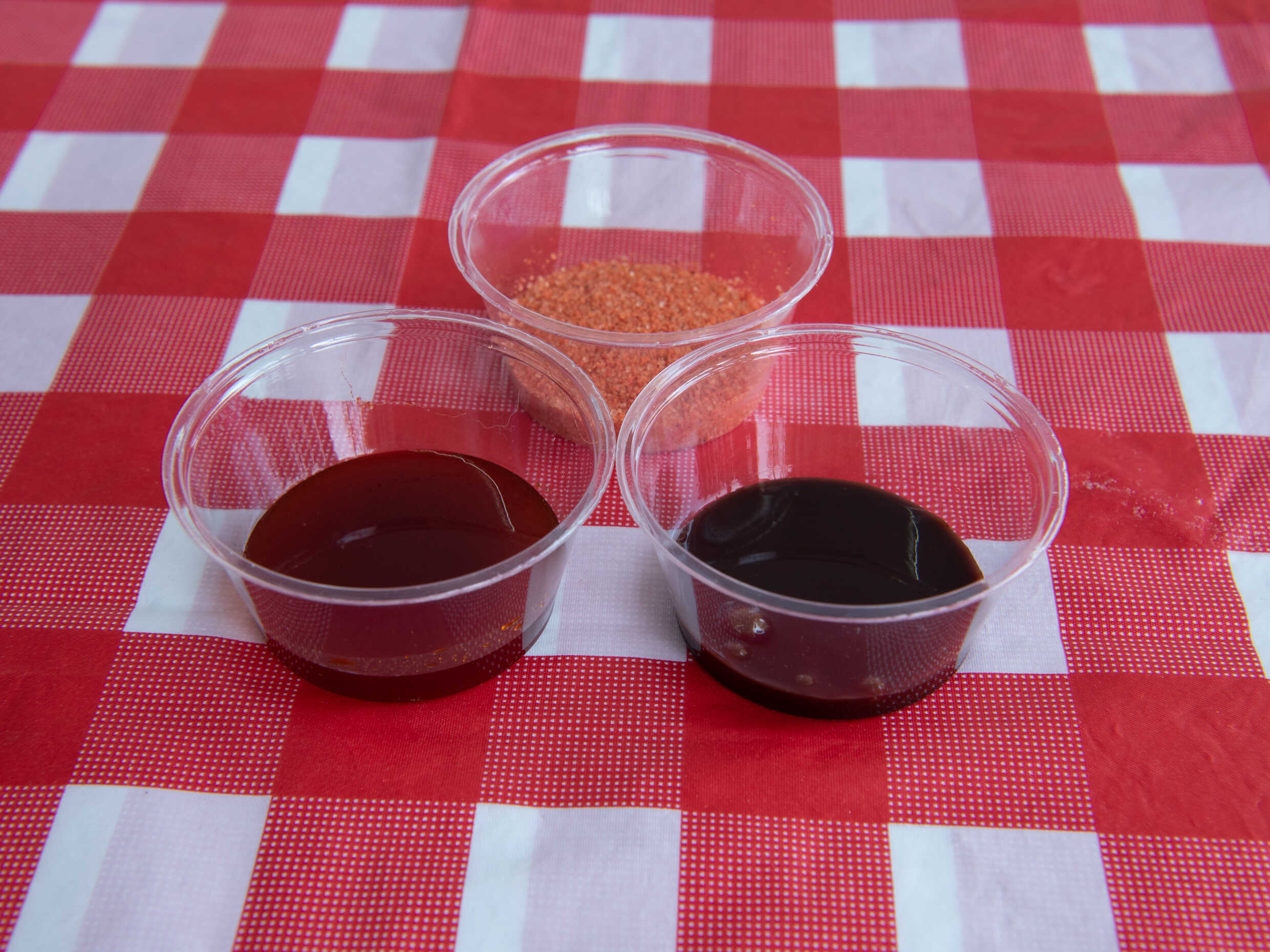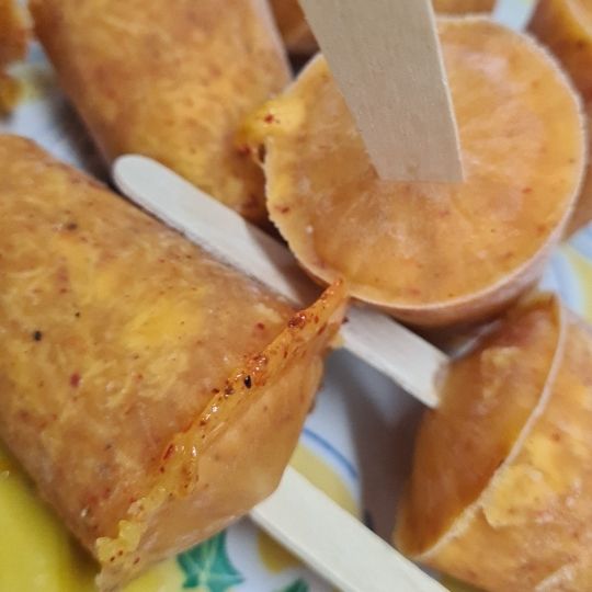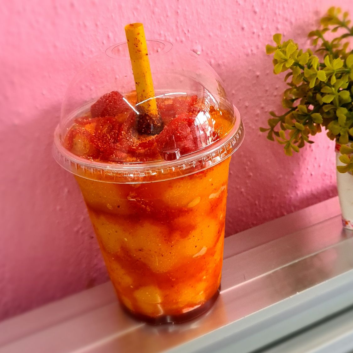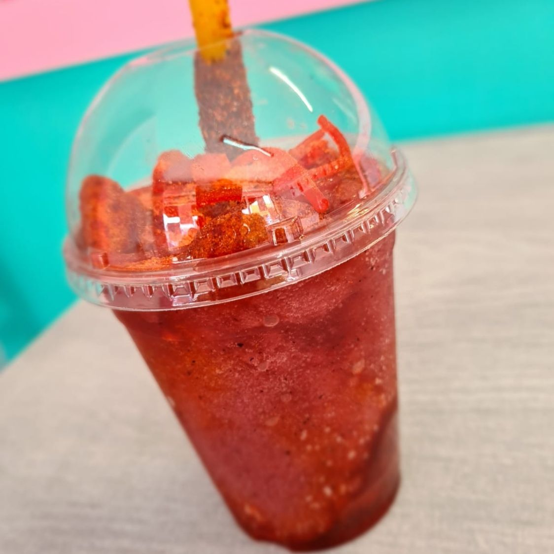 Chamoyada, miguelito de Mango con skwinkles, paleta tamarindo y tamborcitos