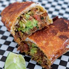 Burrito de harina, relleno de birria, frijoles, aguacate con cebolla y cilantro.