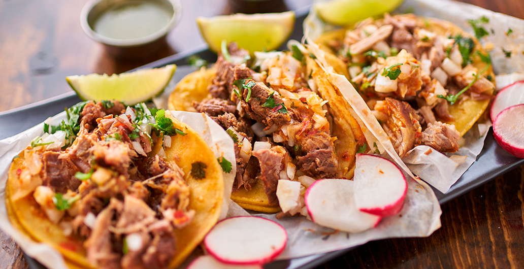 Tortilla de harina 2 pz con queso gouda y Birria acompañada de cebolla, cilantro y salsa tatemada