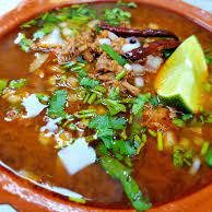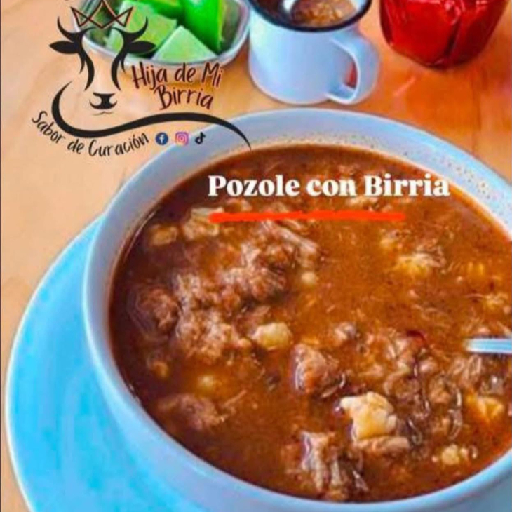 Pozole con Carne de Birria, acompañado de cebolla cilantro , salsa tatemada o arbol, tostadas y crema