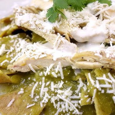 Totopos de maíz , bañados en salsa verde con pollo deshebrado, incluye queso rallado, cebolla y crema