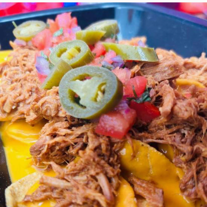 Nachos con Birria , queso derretido , acompañados de verdura pico de gallo y un toque especial de jalapeños
