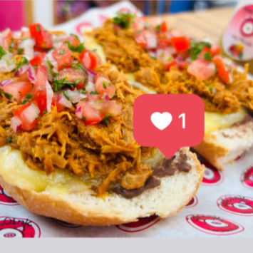 Torta rellena de birria con frijoles, cebolla y cilantro.