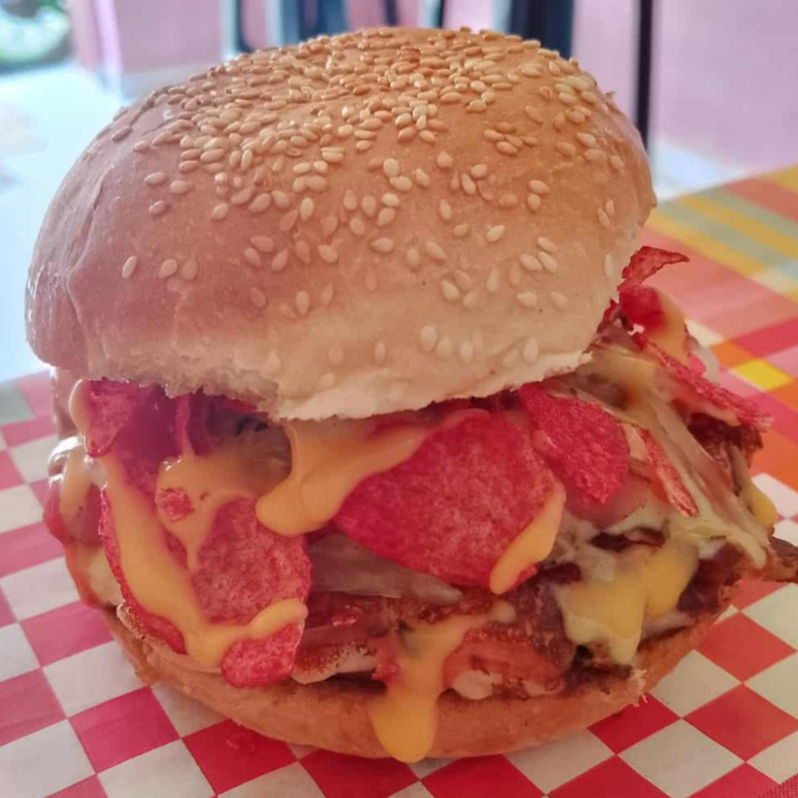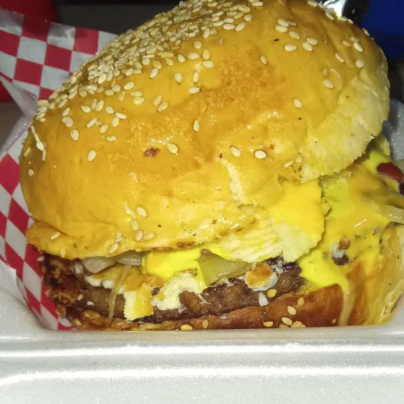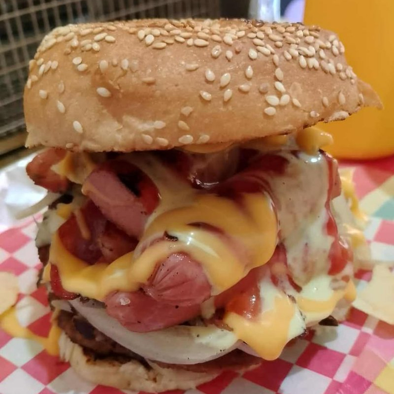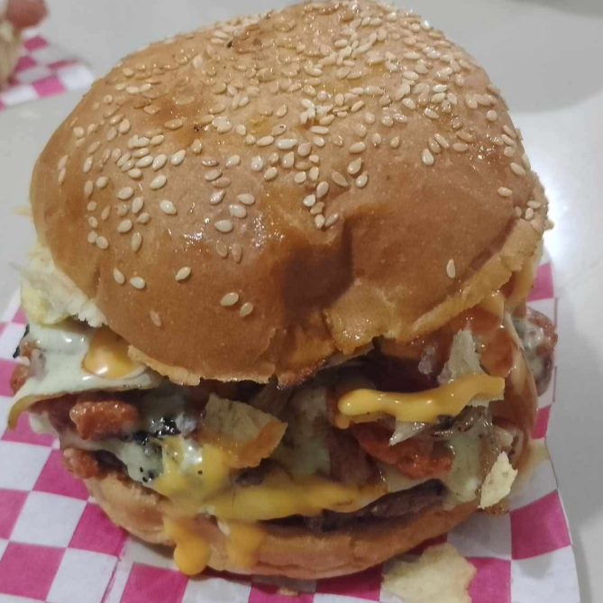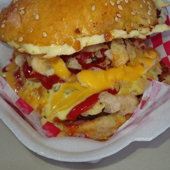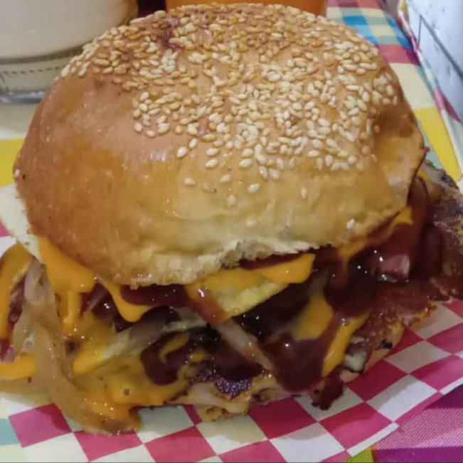 Carne de res con costra de queso mozarella, tocino de pierna, cebolla caramelizada, aderezo de la casa a base de mayonesa, catsup, aderezo de queso amarillo, ripido de papa y para finalizar una costra de queso mozarella en la tapa del pan