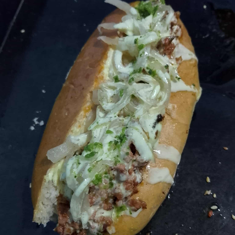Salchicha de pavo asada, cebolla caramelizada, aderezo de la casa a base de mayonesa, catsup, aderezo de queso amarillo y ripiudo de papa natural