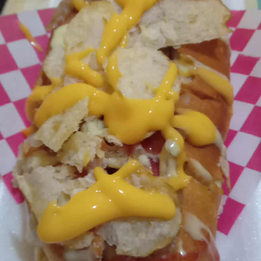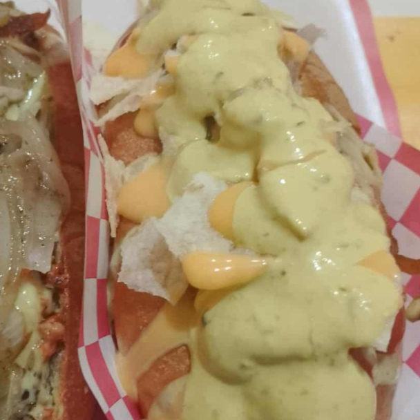 Salchicha de pavo asada, chorizo con queso fundido, cebolla caramelizada, aderezo de la casa a base de mayonnesa, catsup, aderezo de queso amarillo y ripido de papa natural
