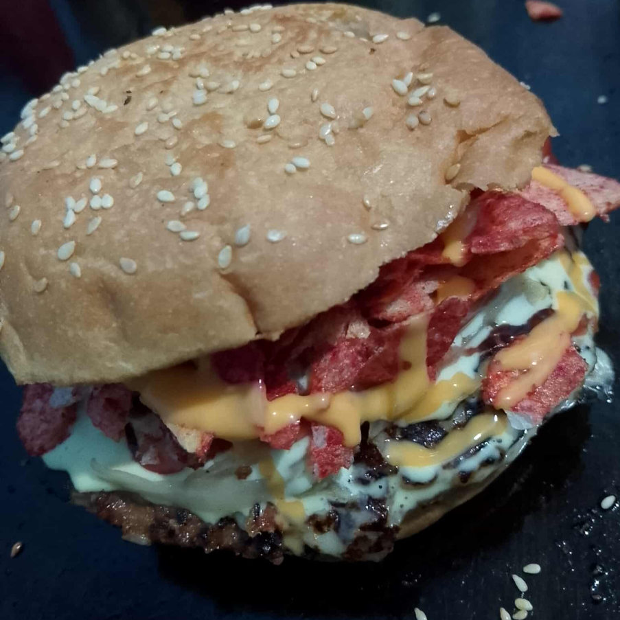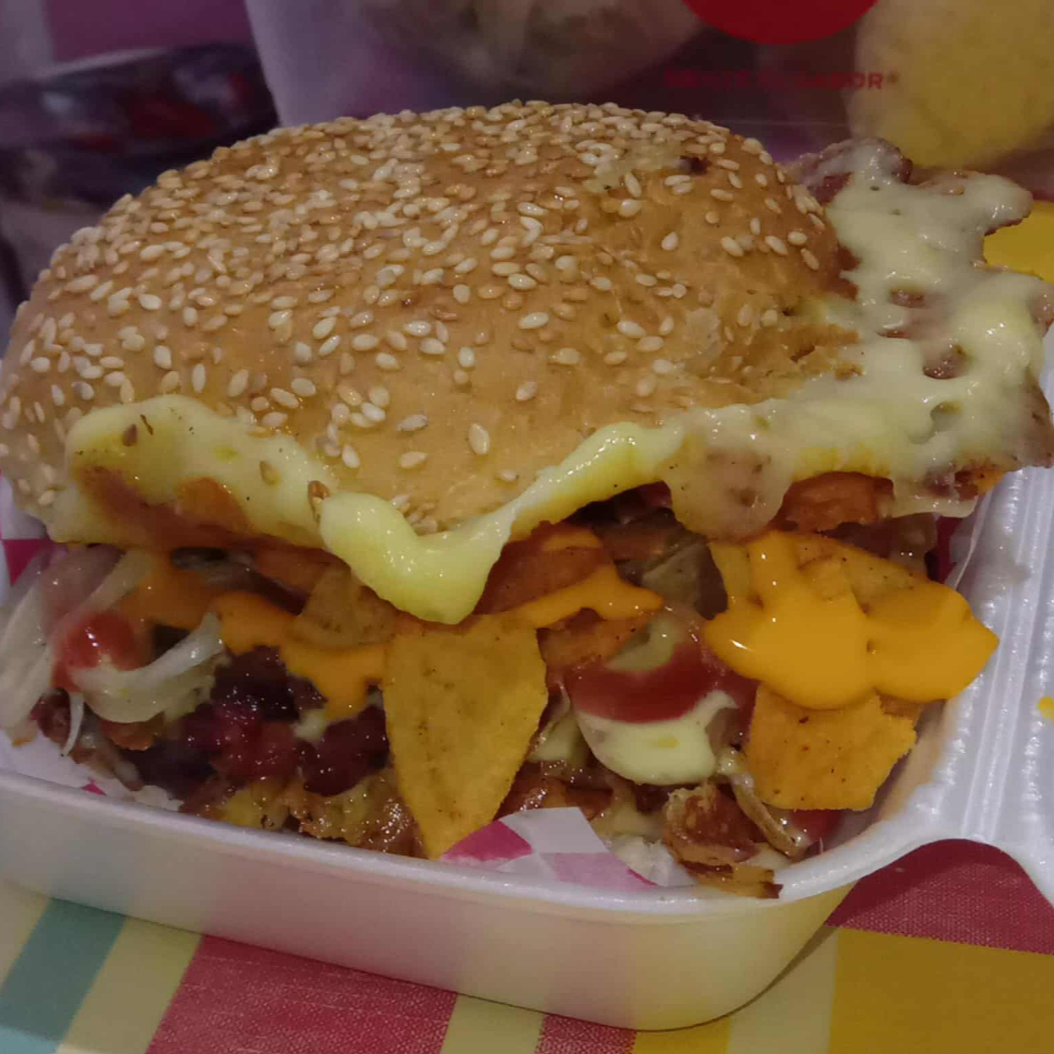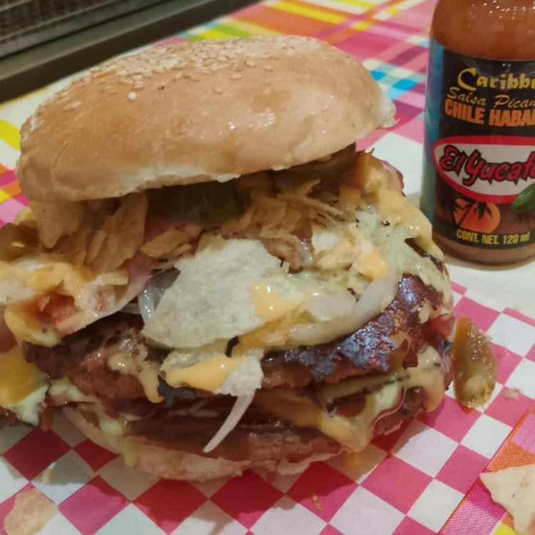 Carne de res con costra de queso mozarella, tocino de pierna, aderezo de la casa a base de mayonesa, catsup, aderezo de guacamole, aderezo de queso amarillo y ripido de papa natural