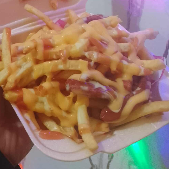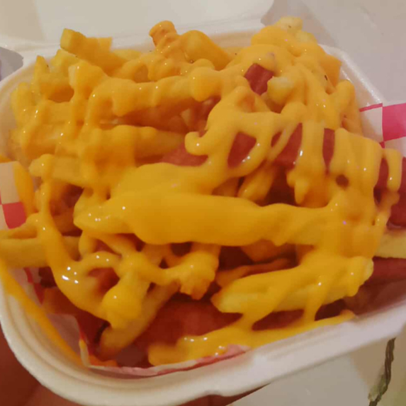 Trocitos de salchicha con papas a la francesa bañada con aderezo de la casa, catsup y queso amarillo