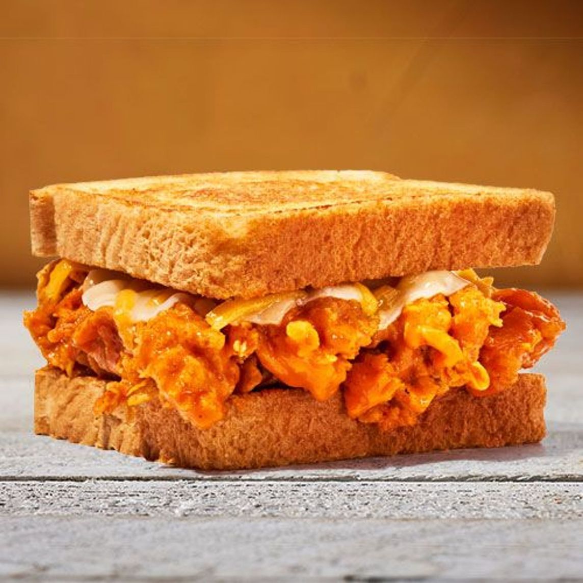 Sándwich con chicken strips (120 g) bañadas con tu Wing Sauce favorita y gratinadas con queso Monterrey y Cheddar. Incluye papas.