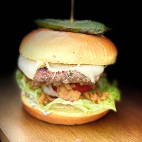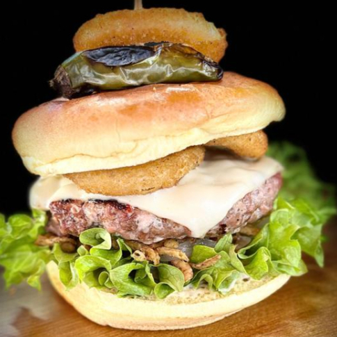 100grs de Carne 100% de Res, condimentada con la receta especial, Aros de Cebolla, Pan Artesanal, Queso Monterrey, Cebolla caramelizada, Lechuga, jitomate y aderezo de la casa.