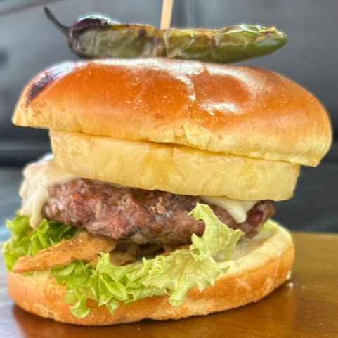 100grs de Carne 100% de Res, condimentada con la receta especial, Piña, Pan Artesanal, Queso Monterrey, Cebolla caramelizada, Lechuga, jitomate y aderezo de la casa.