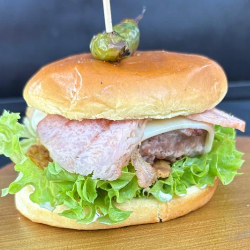 100grs de Carne 100% de Res, condimentada con la receta especial, Tocino, Pan Artesanal, Queso Monterrey, Cebolla caramelizada, Lechuga, jitomate y aderezo de la casa.