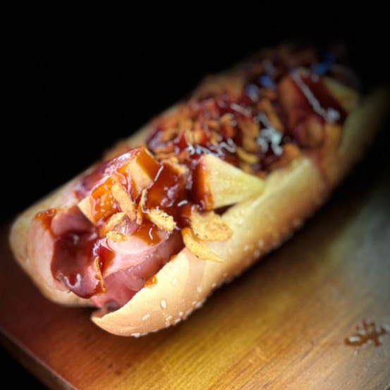 Elaborado con Pan Artesanal y Salchicha Gigante, cebolla caramelizada, cebolla cruji, tocina, BBQ