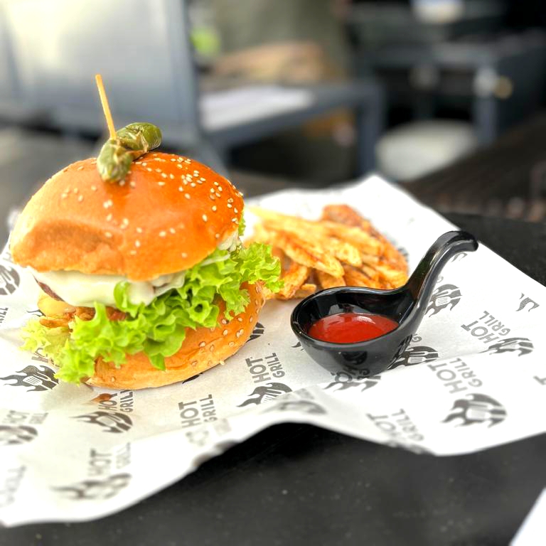 100grs de Carne 100% de Res, condimentada con la receta especial, Pan Artesanal, Queso Monterrey, Cebolla caramelizada, Lechuga, jitomate y aderezo de la casa.