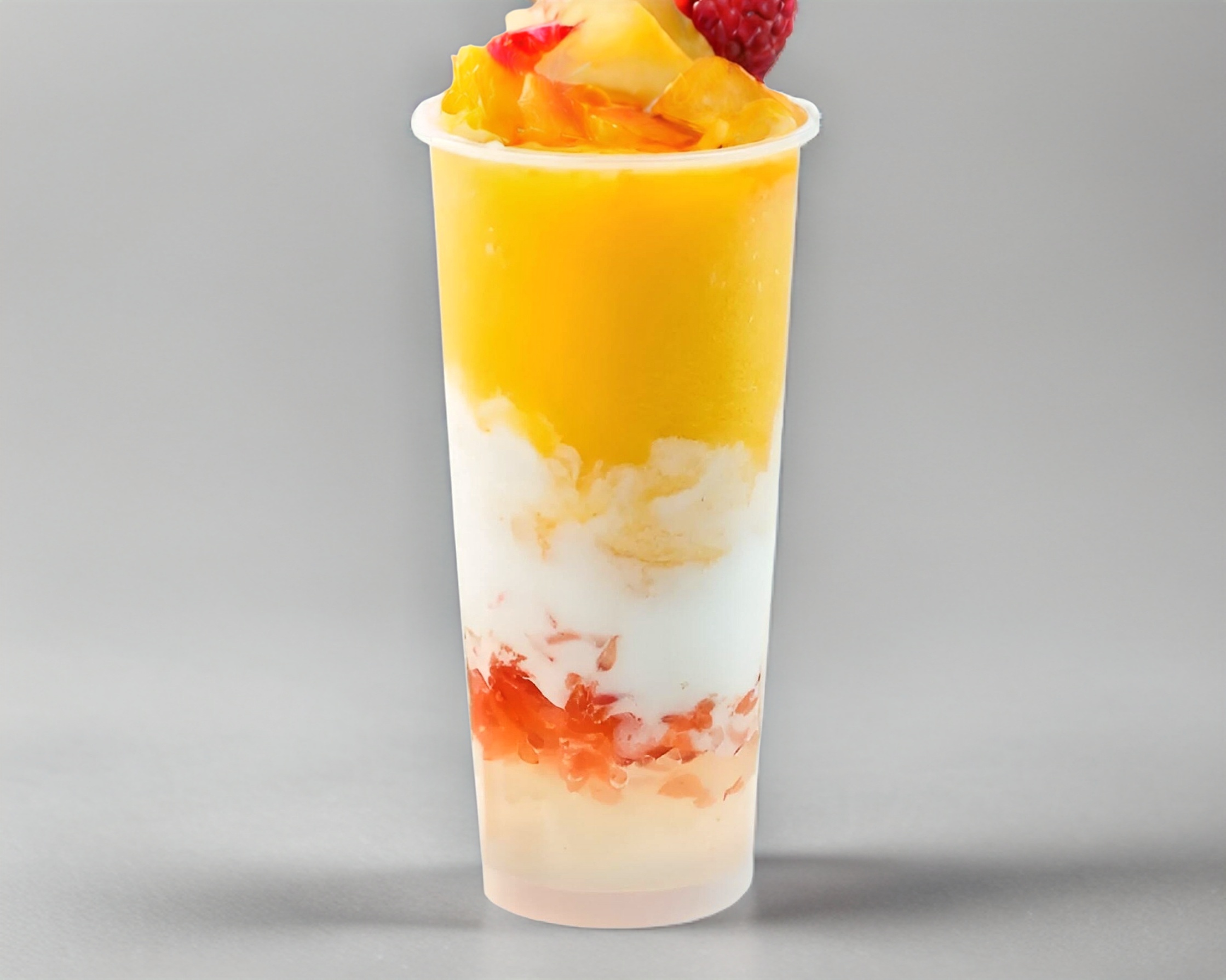 Una bebida tropical con distintas capas de sabores, acompañada de perlas de tapiocas blancas, toronja, leche de coco, cheese foam y un batido de mango cremoso.
