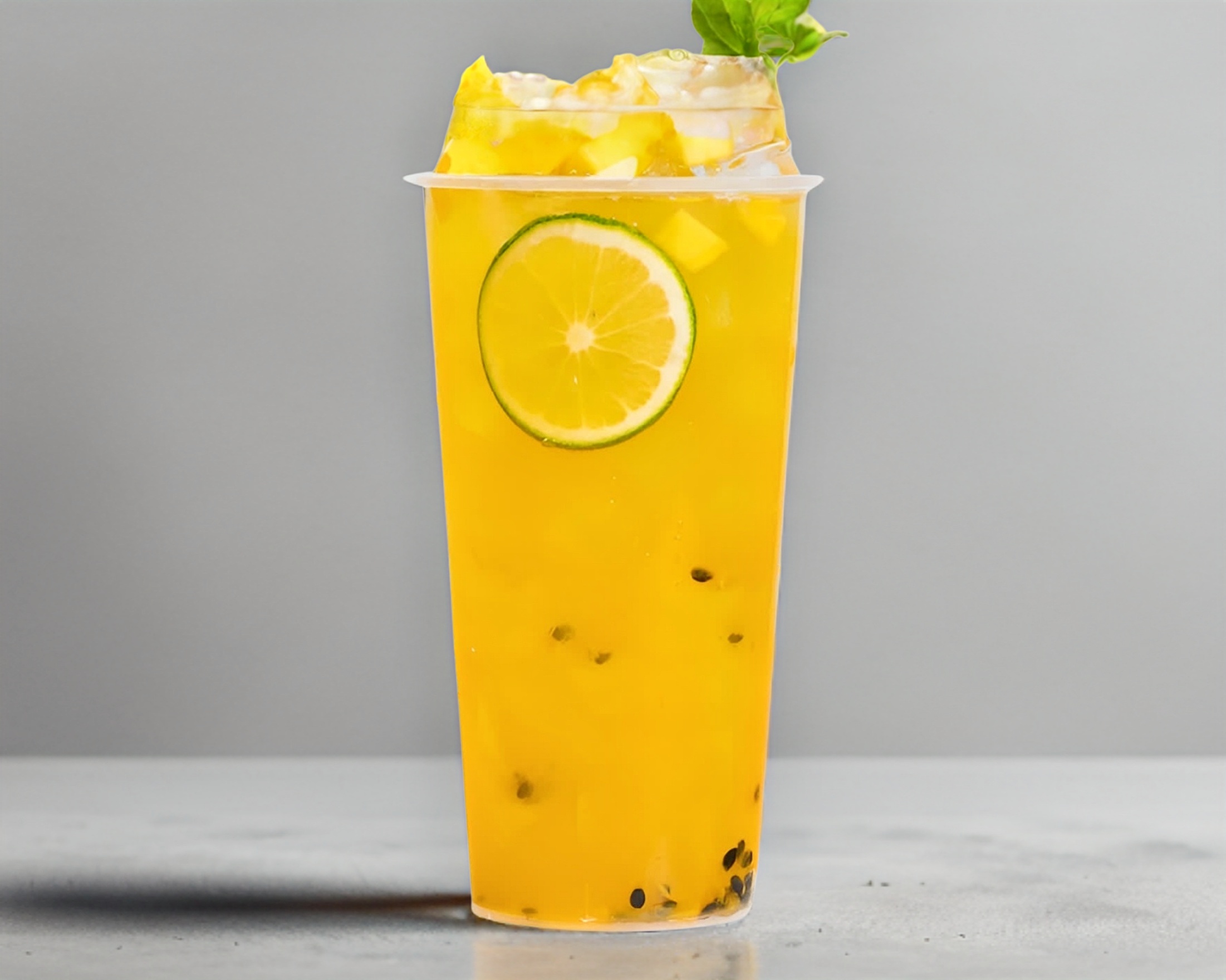 Una mezcla frutal natural de pulpa de mango y maracuyá con base de te verde helado.
