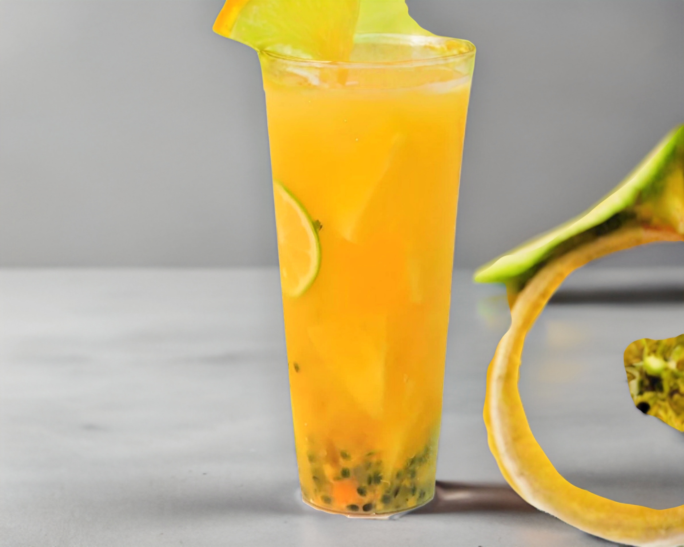 Una mezcla frutal natural de pulpa de piña y maracuyá con base de te verde helado.