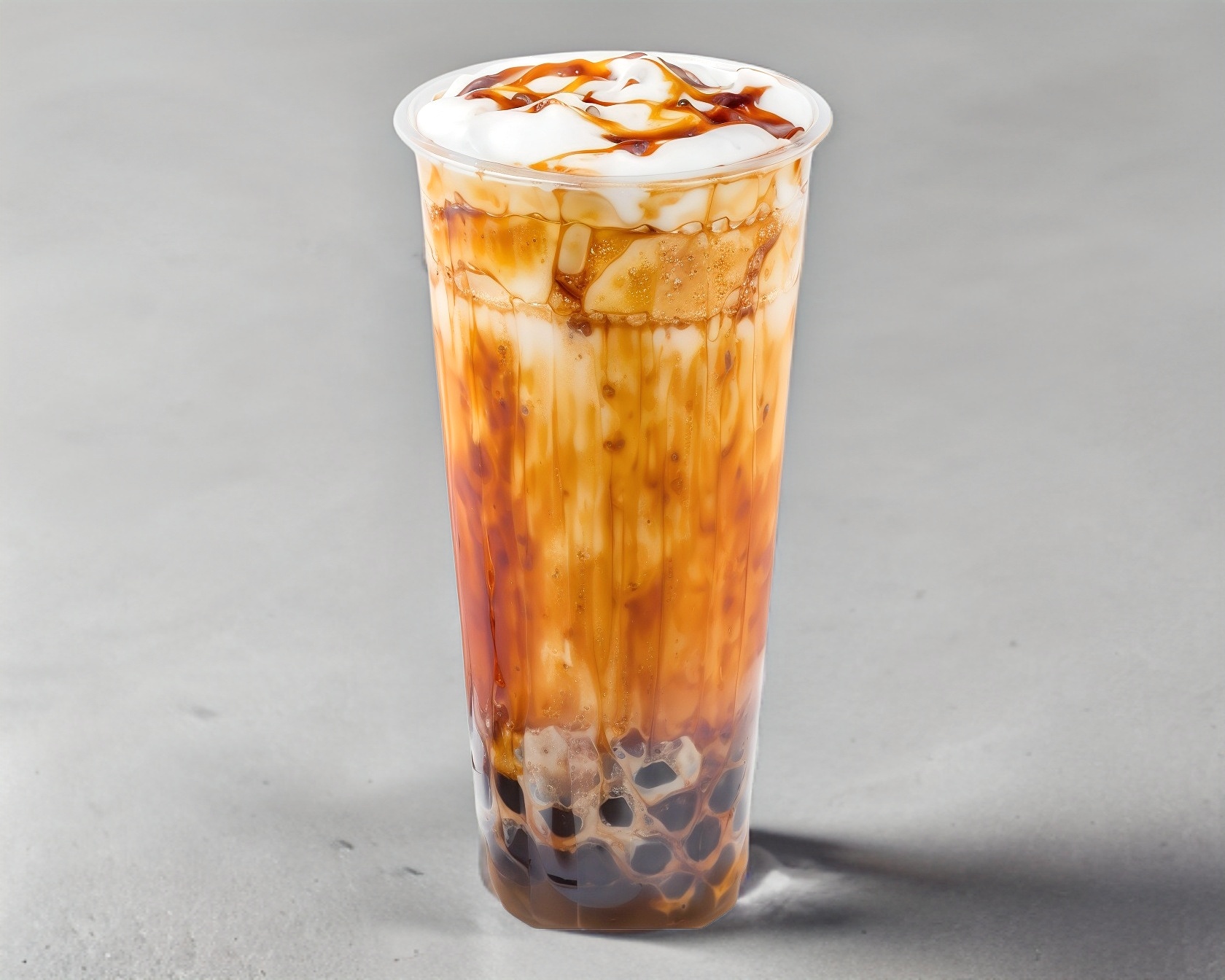 A base de te negro con leche y tapioca negra, ademas con un toque de azucar morena que aporta un sabor profundo y ligeramente caramelizado.