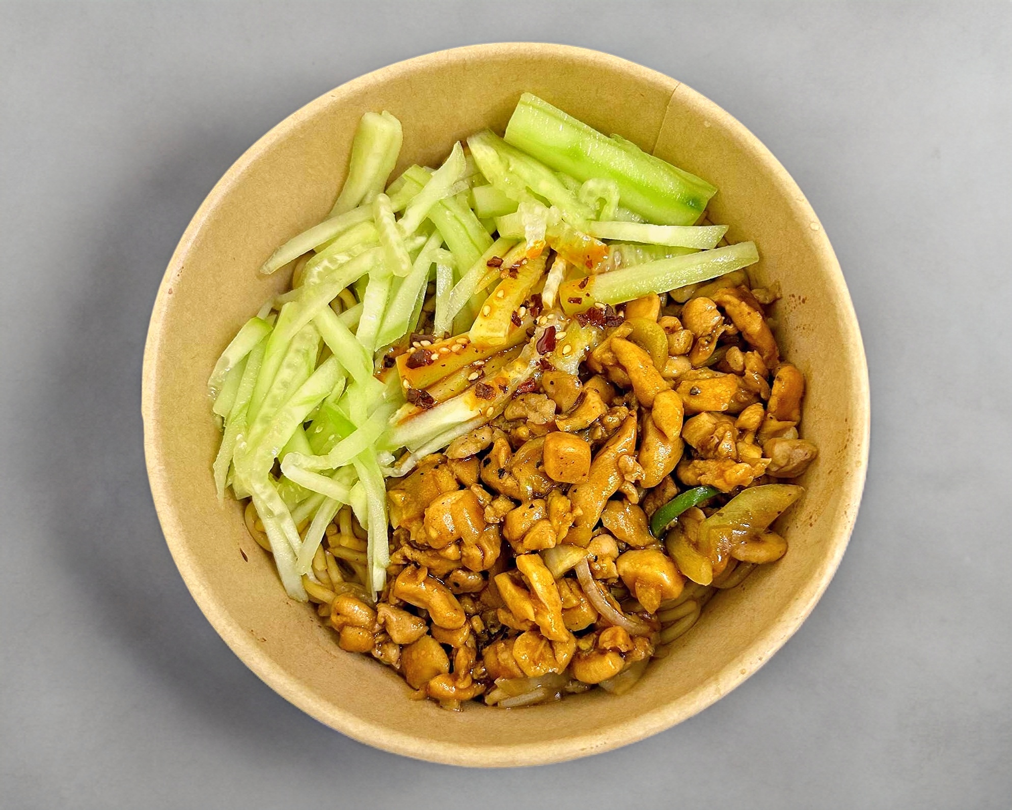 Fideo de arroz perfectamente cocidos con tiernos trozos de pollo salteado en salsa especial , crujientes pepinos frescos y un toque de chile.