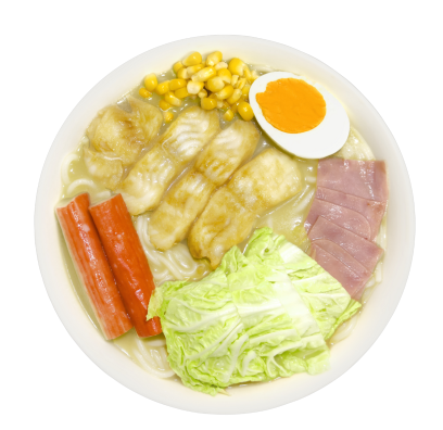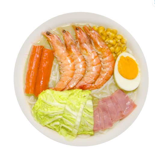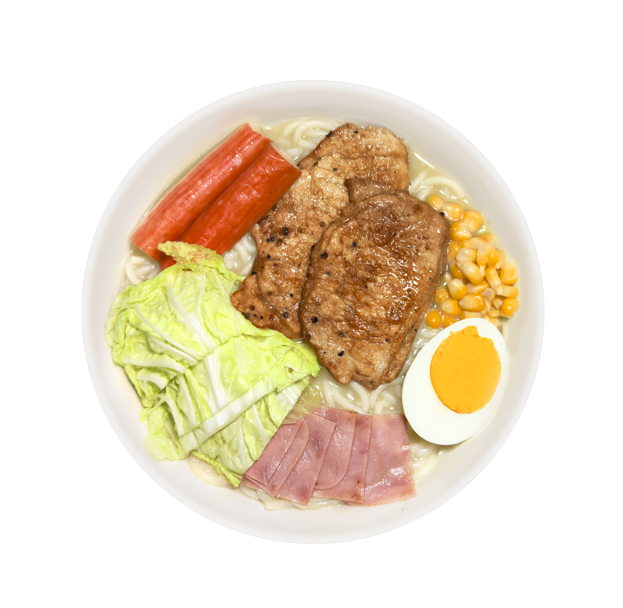 Con pasta de fideo de arroz a base de caldo de hueso de cerdo, un sabor inigualable, con guarniciones de verdura, elote, huevo, jamón, surimi y carne de cerdo, también puedes seleccionar tu caldo con o sin picante (chile de árbol en aceite).