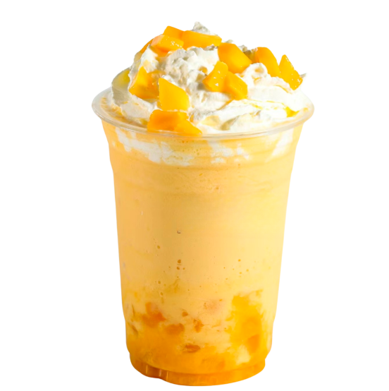 Frappe de yogurt con mango, una bebida refrescante que combina la cremosidad del yogurt con el sabor tropical del mango fresco. cada sorbo esta lleno de trocitos de mango que agregan una textura irresistible, complementando con una generosa capa de crema batida.