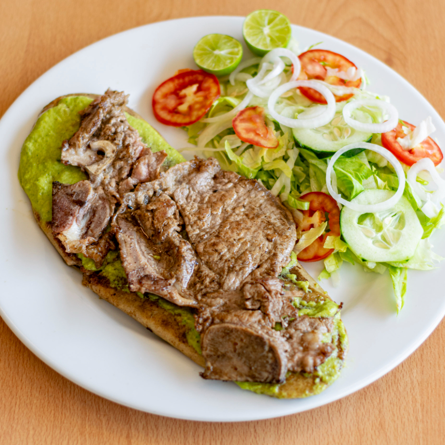 Nuestra especialidad huarache de 30 cm relleno de frijoles bañado con salsa verde o roja y 100 grs de costilla de res no incluye guarnicion