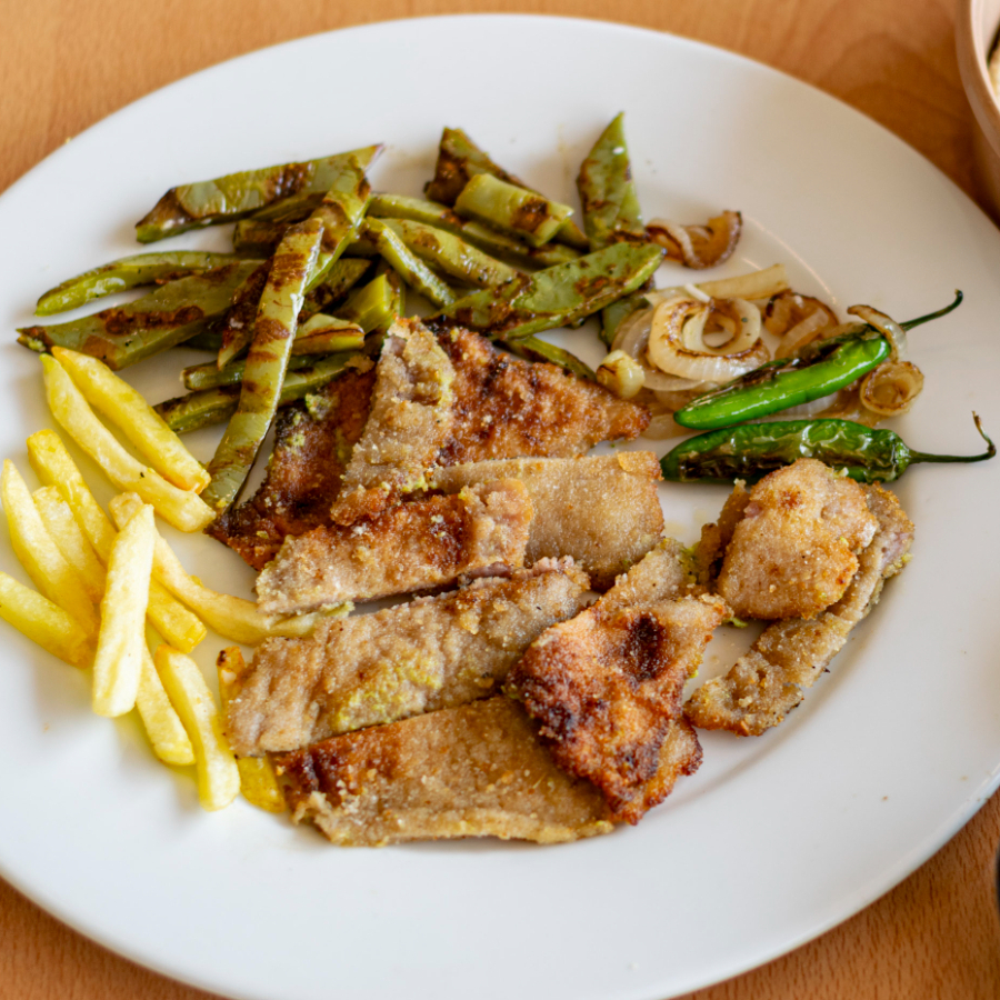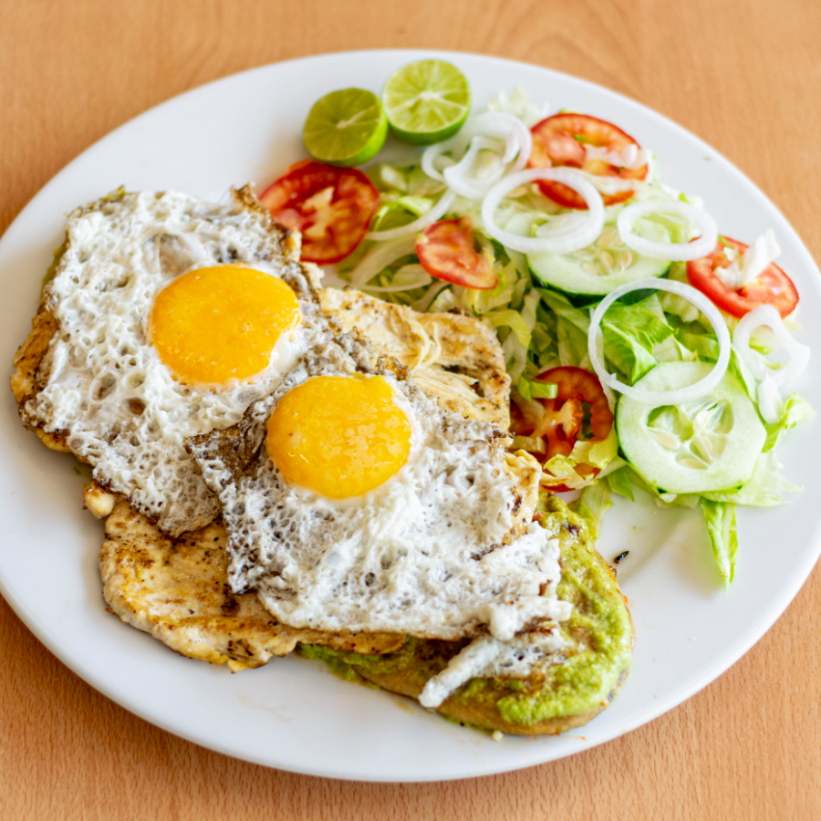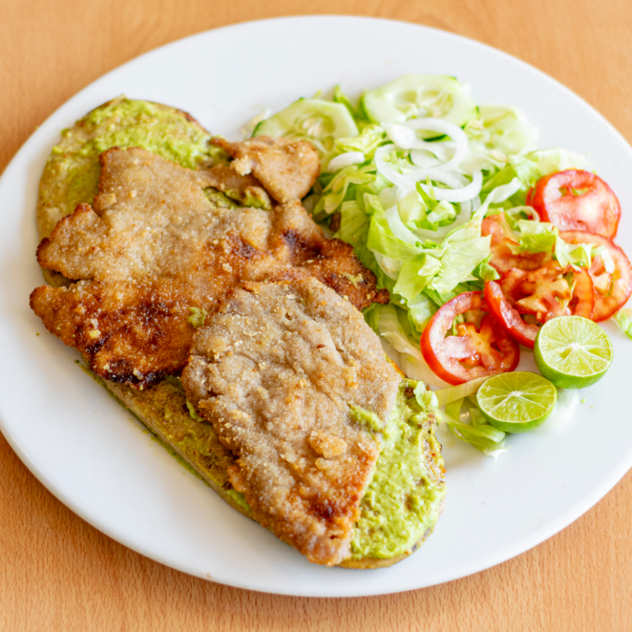 Milanesa con aguacate rebanado, papas a la francesa, ensalada o frijoles.