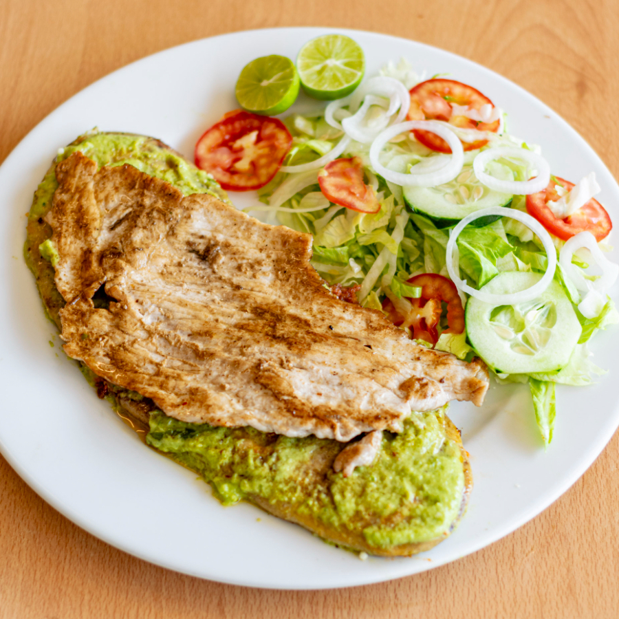 Huarache de 30 cm relleno de frijoles bañado con salsa roja o verde y 100 grs de milanesa de cerdo empanizada no incluye guarnicion