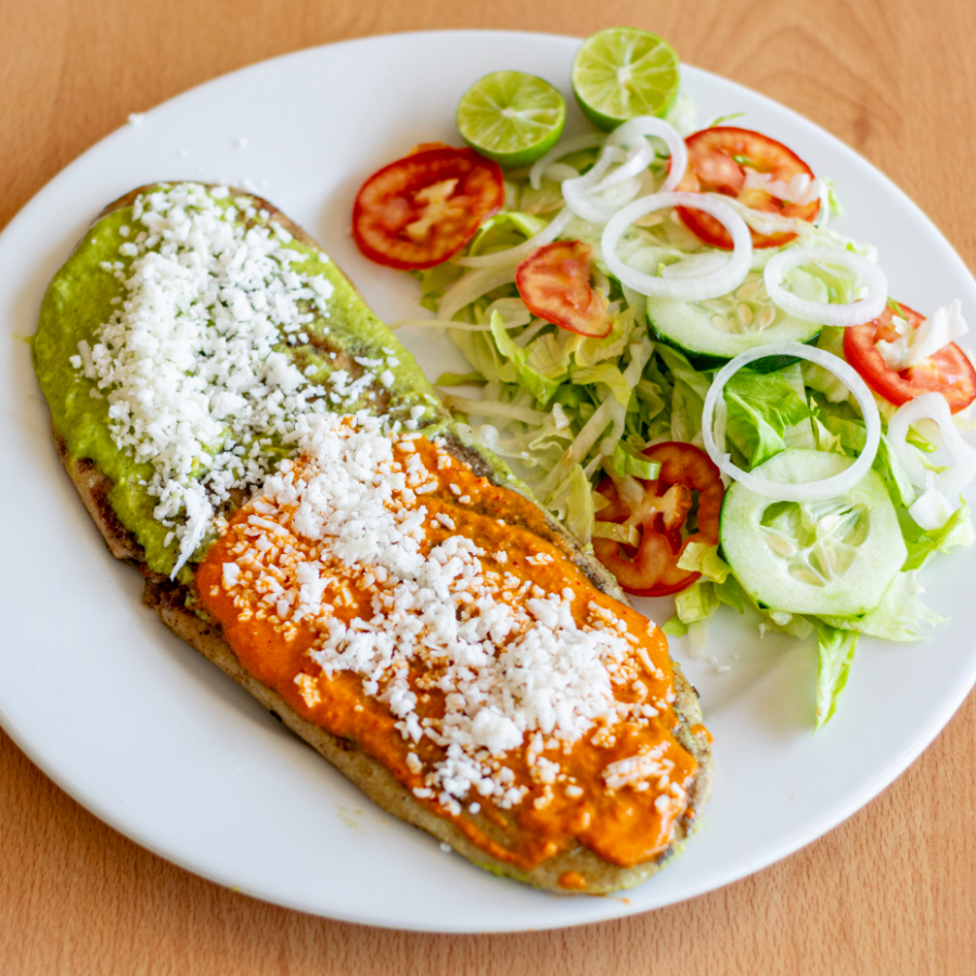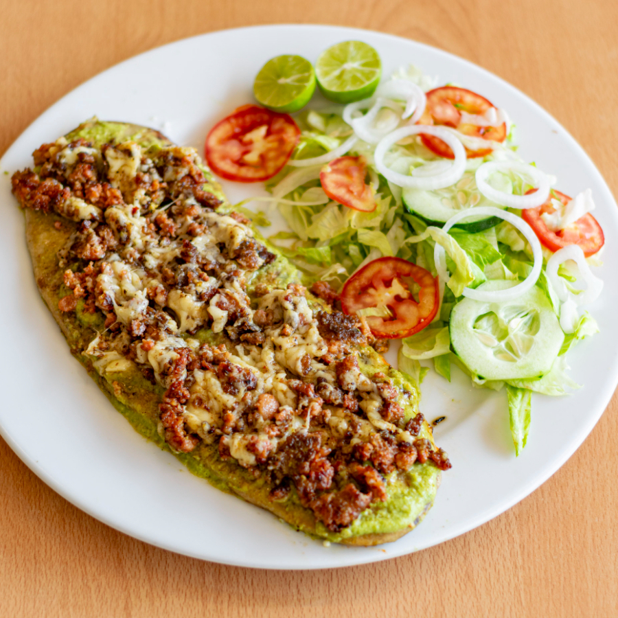 Huarache de 30 cm relleno de frijoles bañado con salsa verde o roja 100 grs de chorizo y queso gratinado no incluye guarnicion