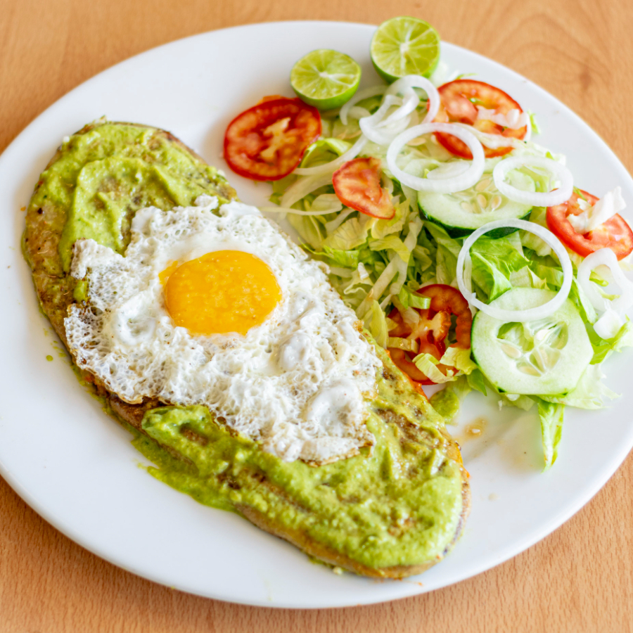 Huarache de 30 cm relleno de frijoles bañado con salsa roja o verde con pechuga aplanada con crema y 2 huevos montados no incluye guarnicion