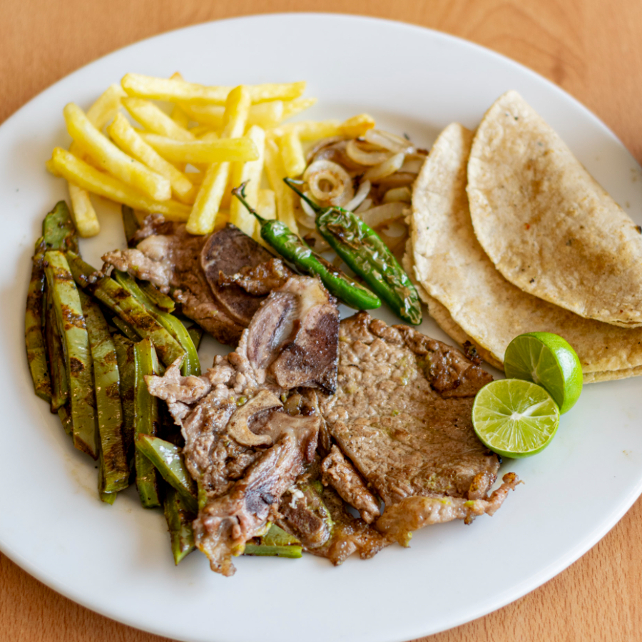 100grs de costilla asada Acompañado de nopales cebolla y papas,tortillas limones y salsa