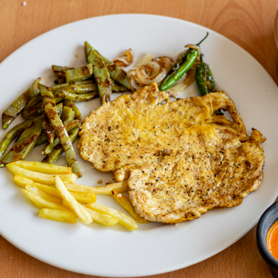 Milanesa de pollo con papas a la francesa o ensalada.