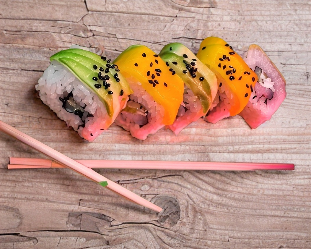 Por fuera: Arroz. Ajonjoli Tostado. Por dentro: Aguacate, Pepino y Pimiento asado.
