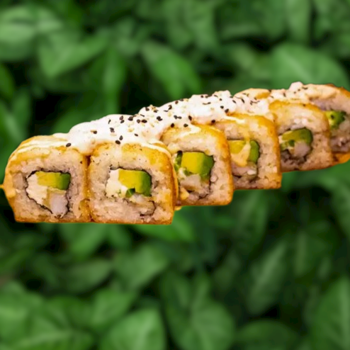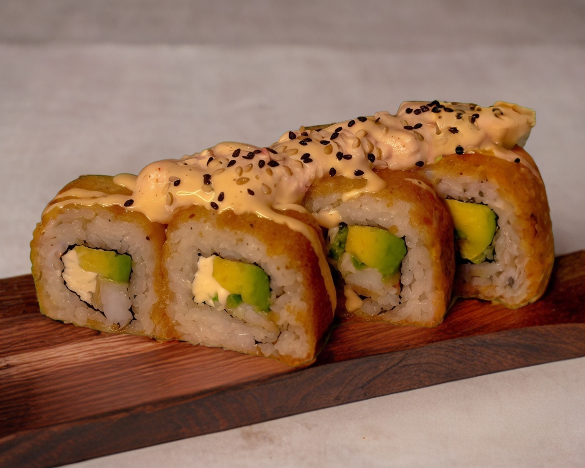Por fuera: Empanizado. Por dentro: Aguacate, Queso crema y Camaron Topping de Salsa Tampico.