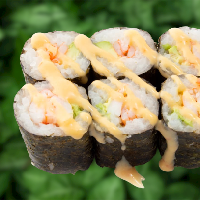 *Maki delgado 8 pza. Por fuera: Nori, Salsa Chipotle. Por dentro: Camarón, Aguacate * Rollos de tamaño más pequeño que nuestros rollos que ya conoces.
