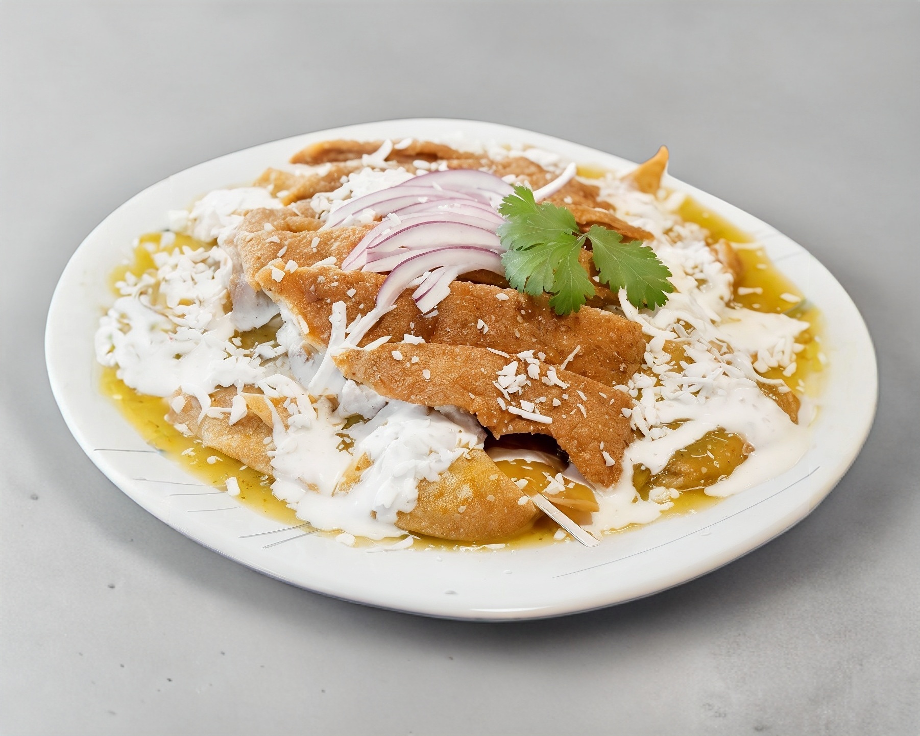 Chilaquiles verdes con pollo y gratinados con queso manchego. para una persona