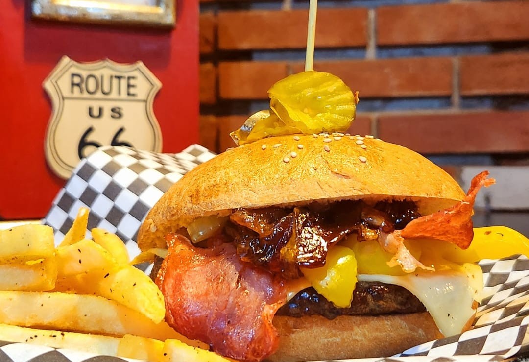 150 gr. De carne de res acompañado de queso amarillo + queso manchego + tocino + cebolla caramelizada y salsa de tu elección + 220 gr. de papas.