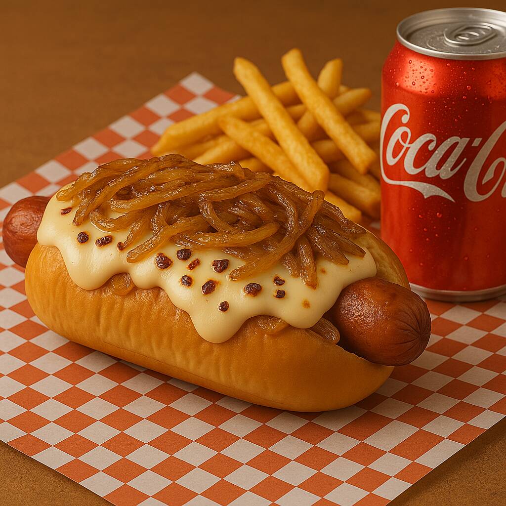 Pan brioche, mayonesa de ajo, salchicha, cebolla caramelizada. Papas a la francesa y refresco en lata de 355ml