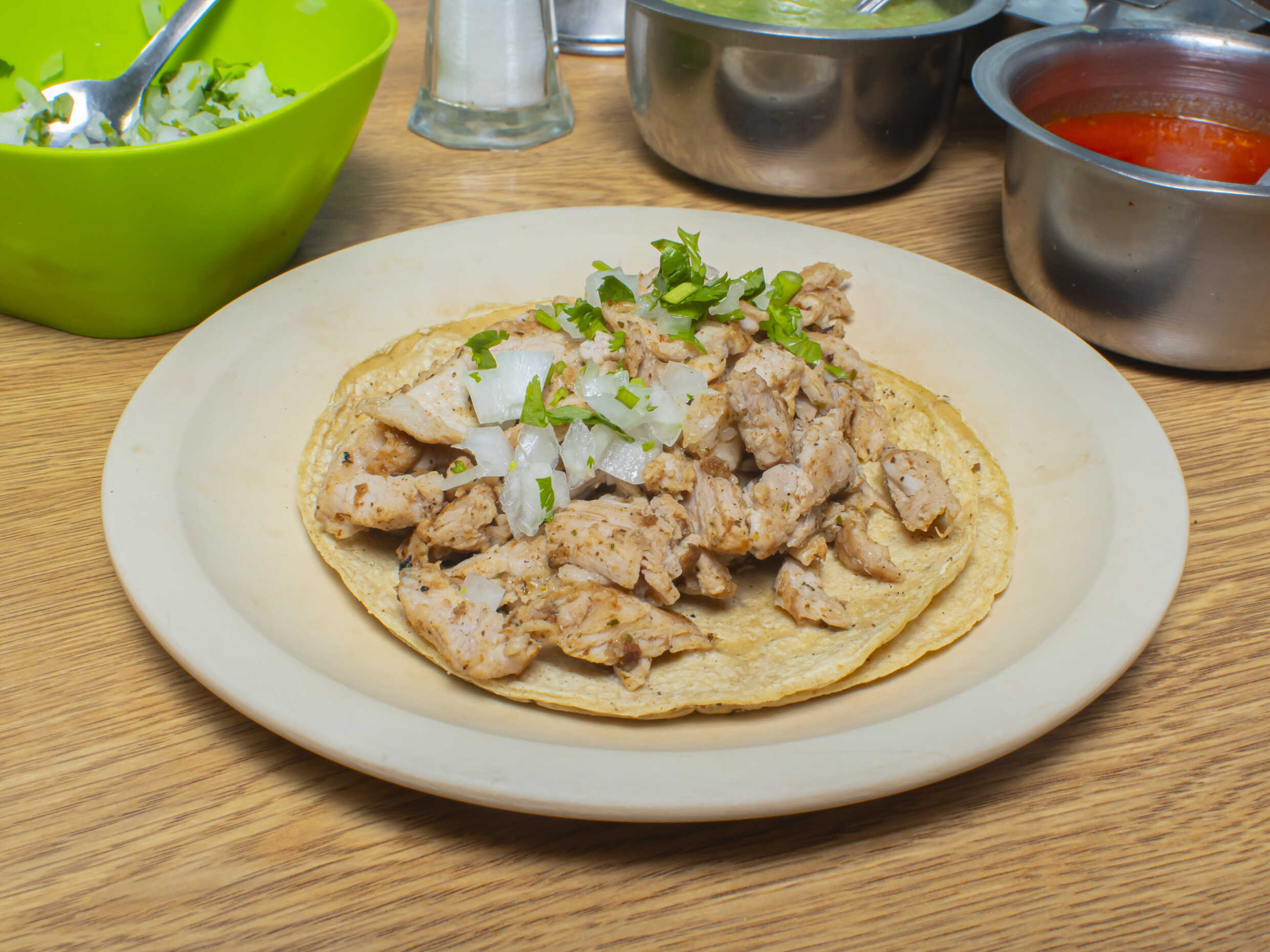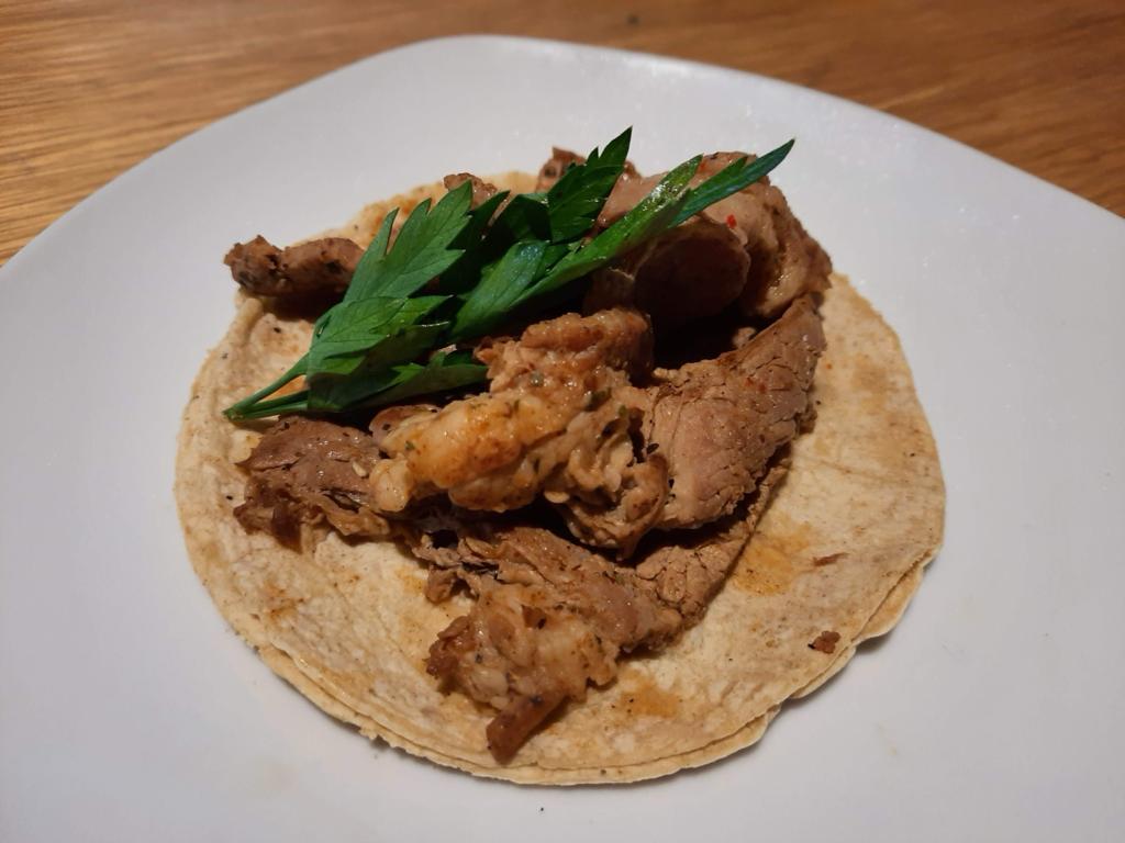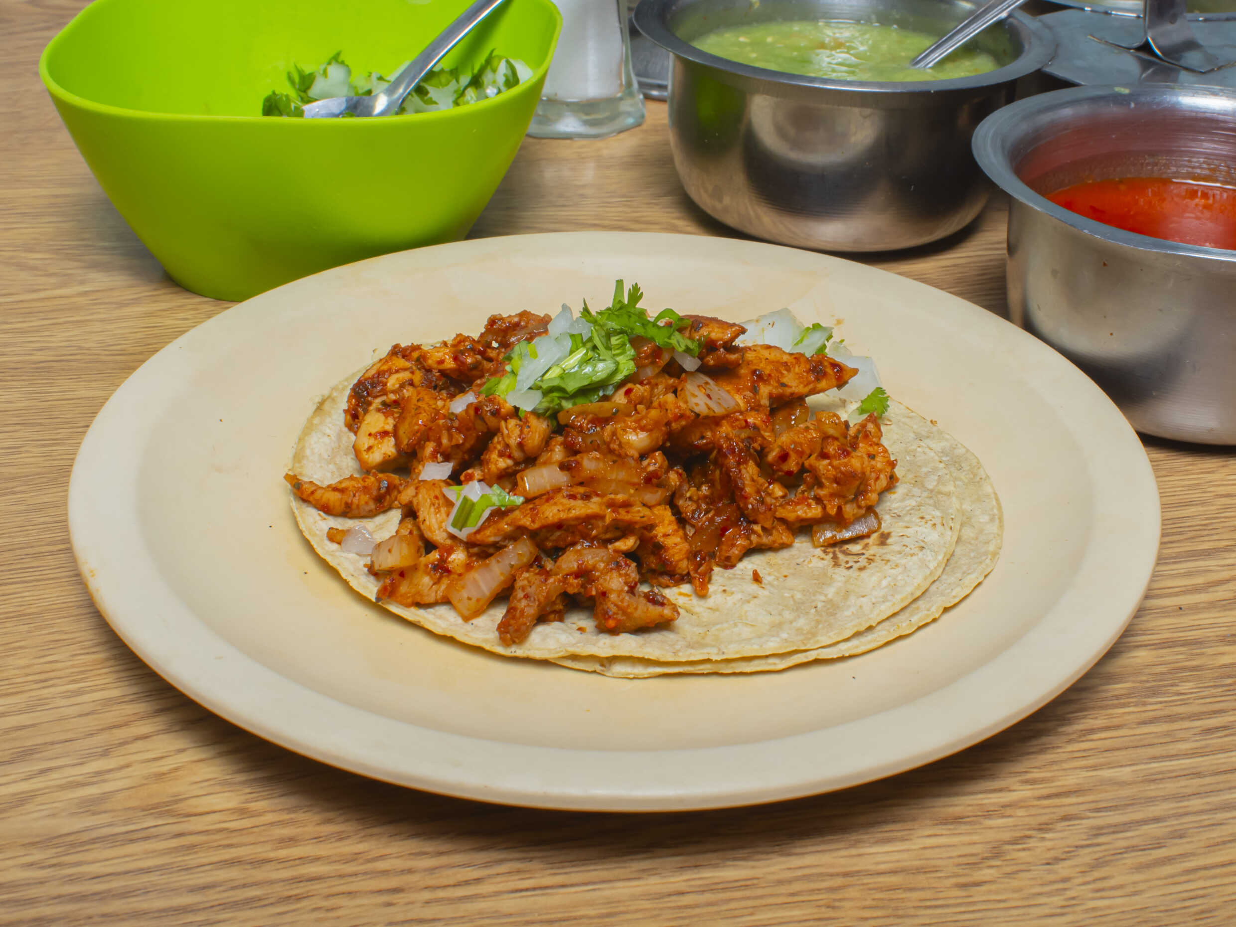 Tortilla de maíz con bistec de cerdo, acompañados de salsa.