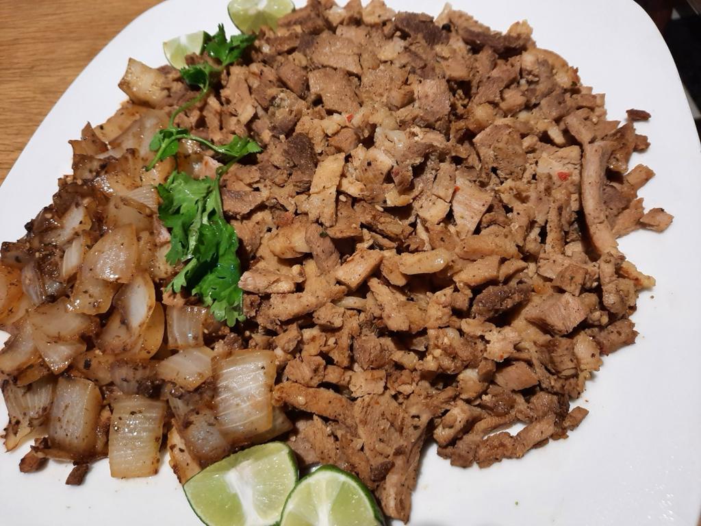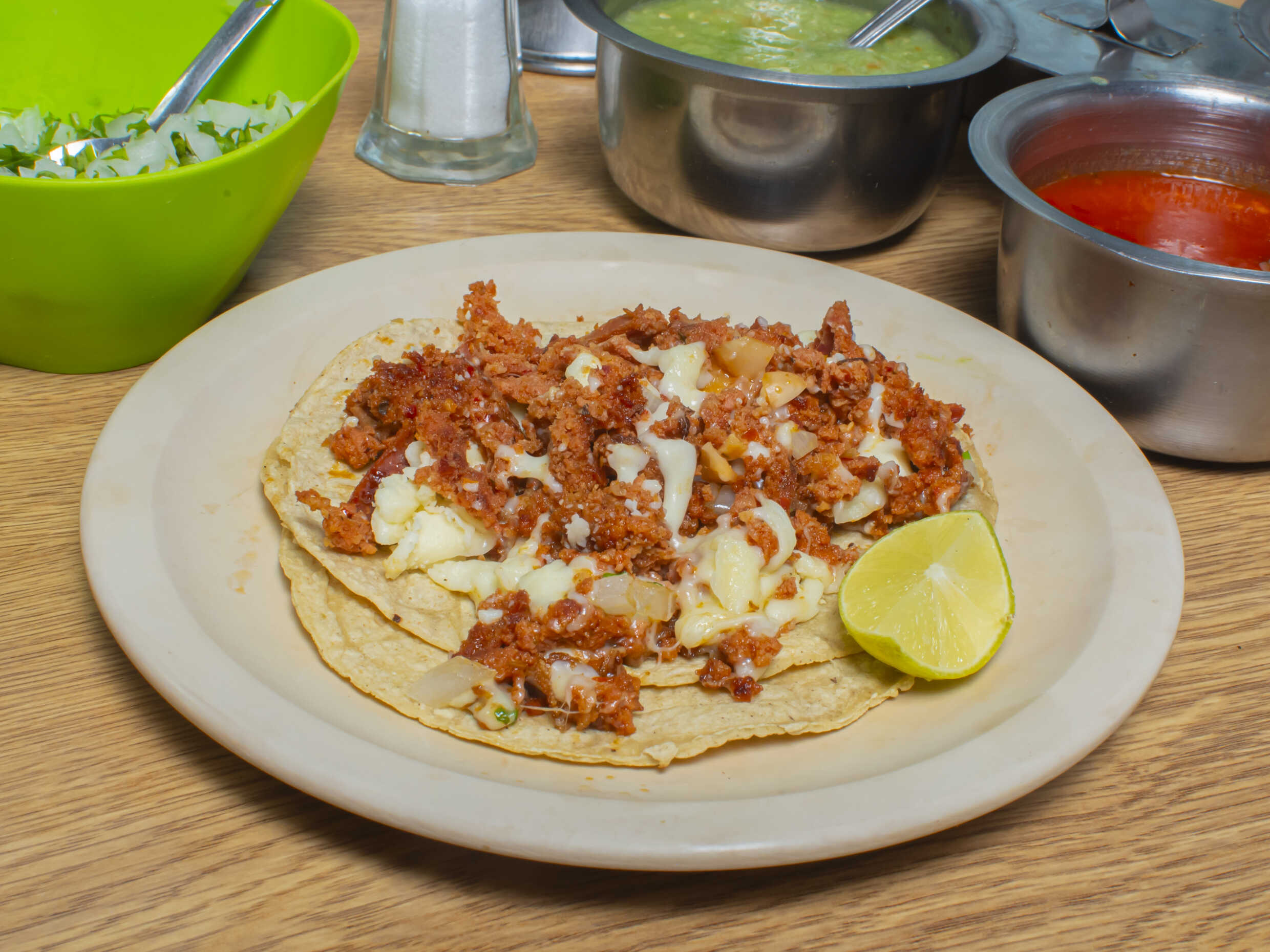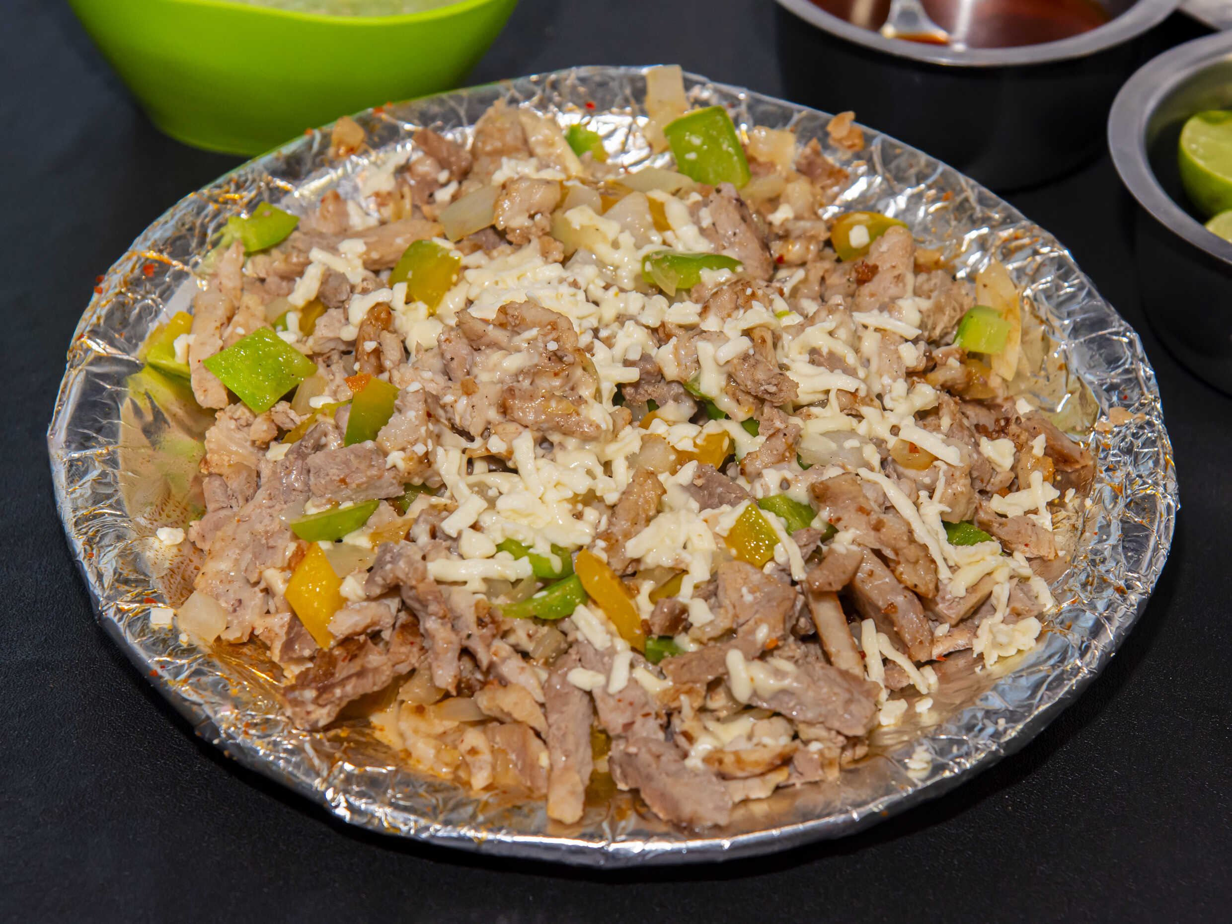 Cebolla, morrón y queso. 300gr de Carne con Tortillas, Limones, Salsa a Elegir: Oriental, Verde Habanero, Roja Chile de Arbol