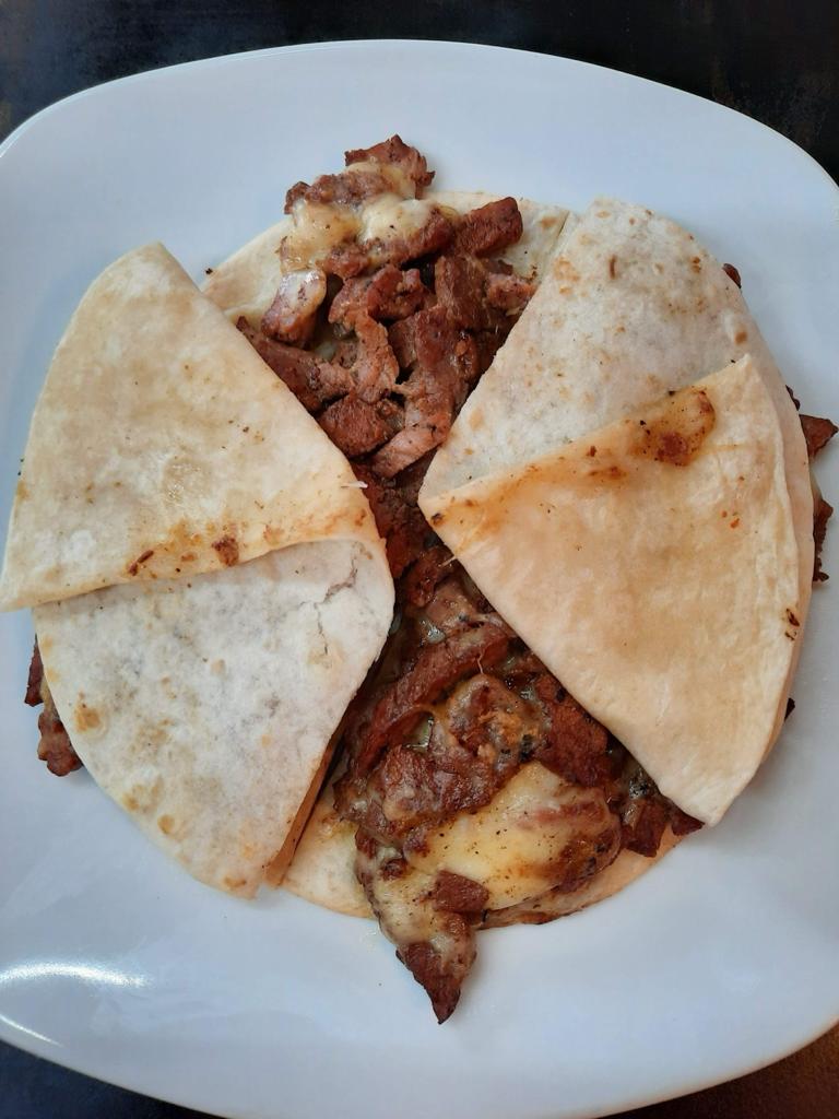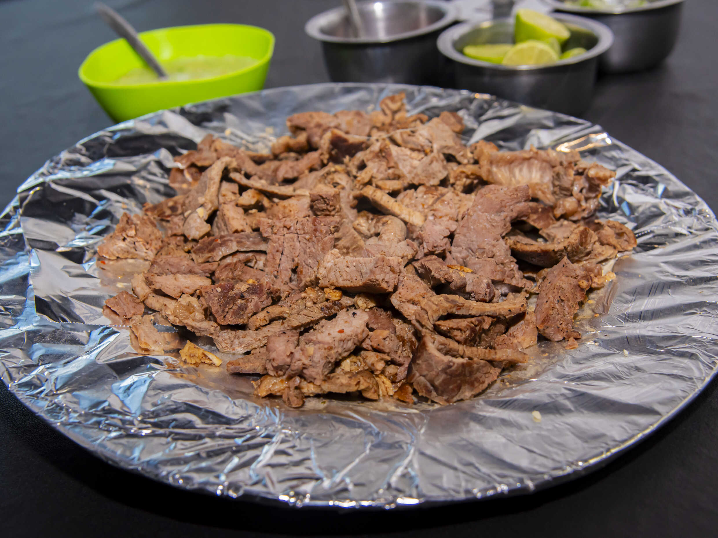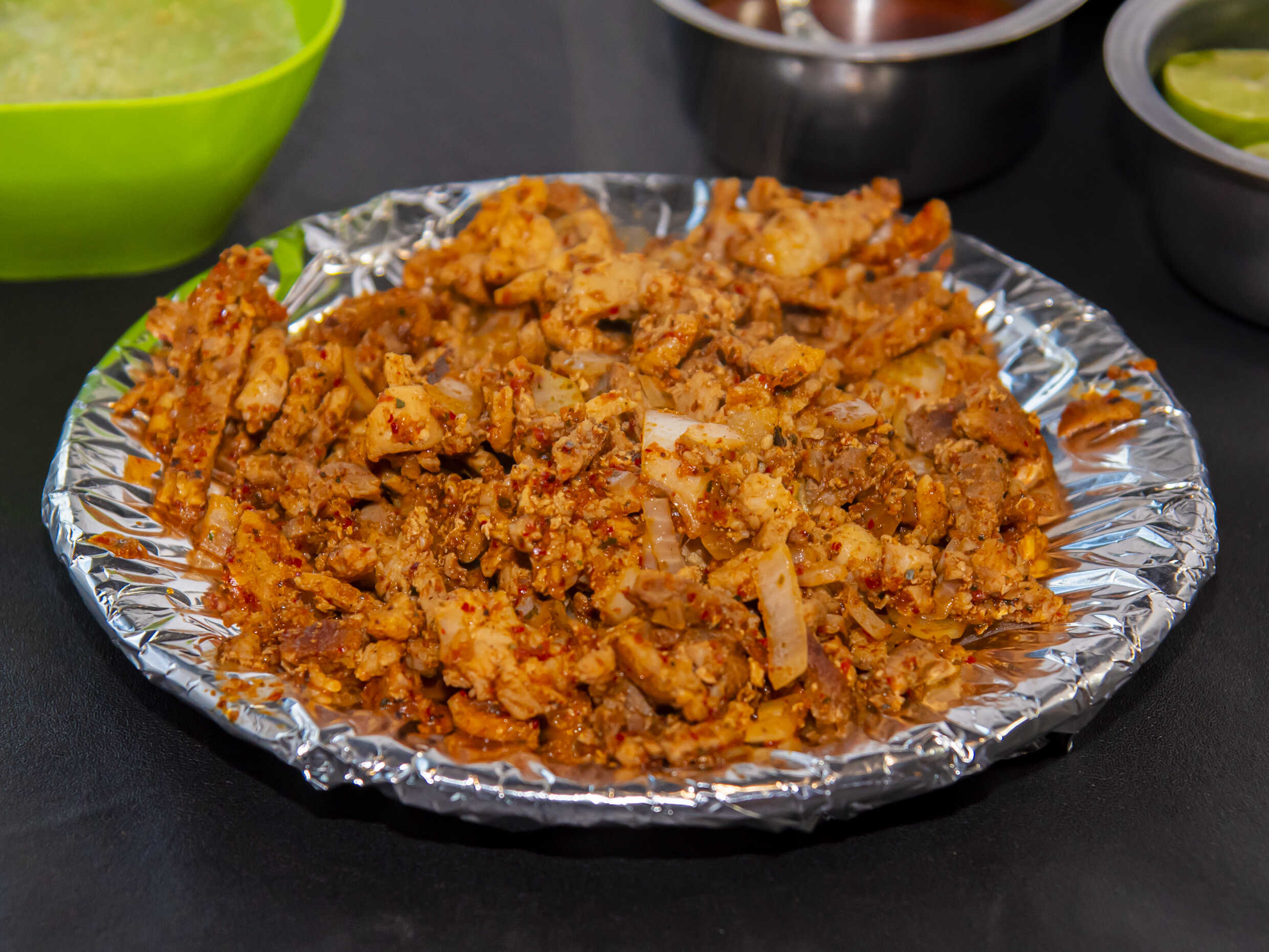 Cebolla, morrón y queso. 300gr de Carne con Tortillas, Limones, Salsa a Elegir: Oriental, Verde Habanero, Roja Chile de Arbol