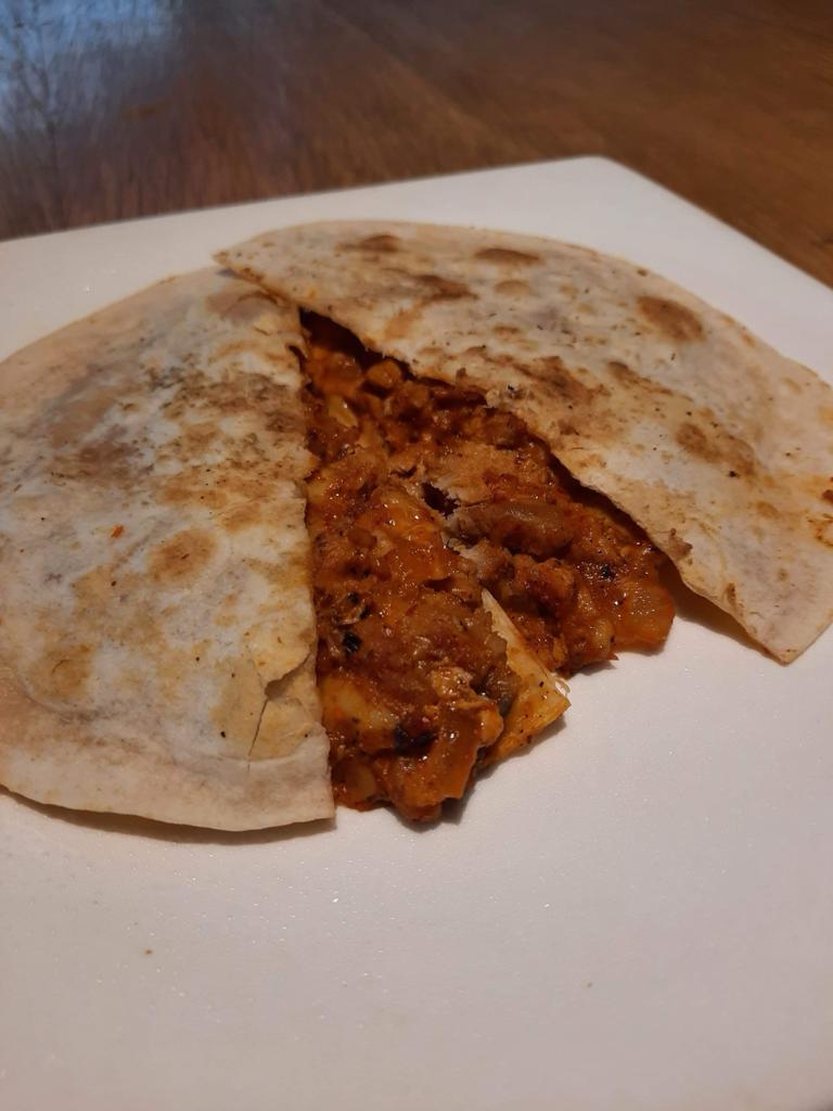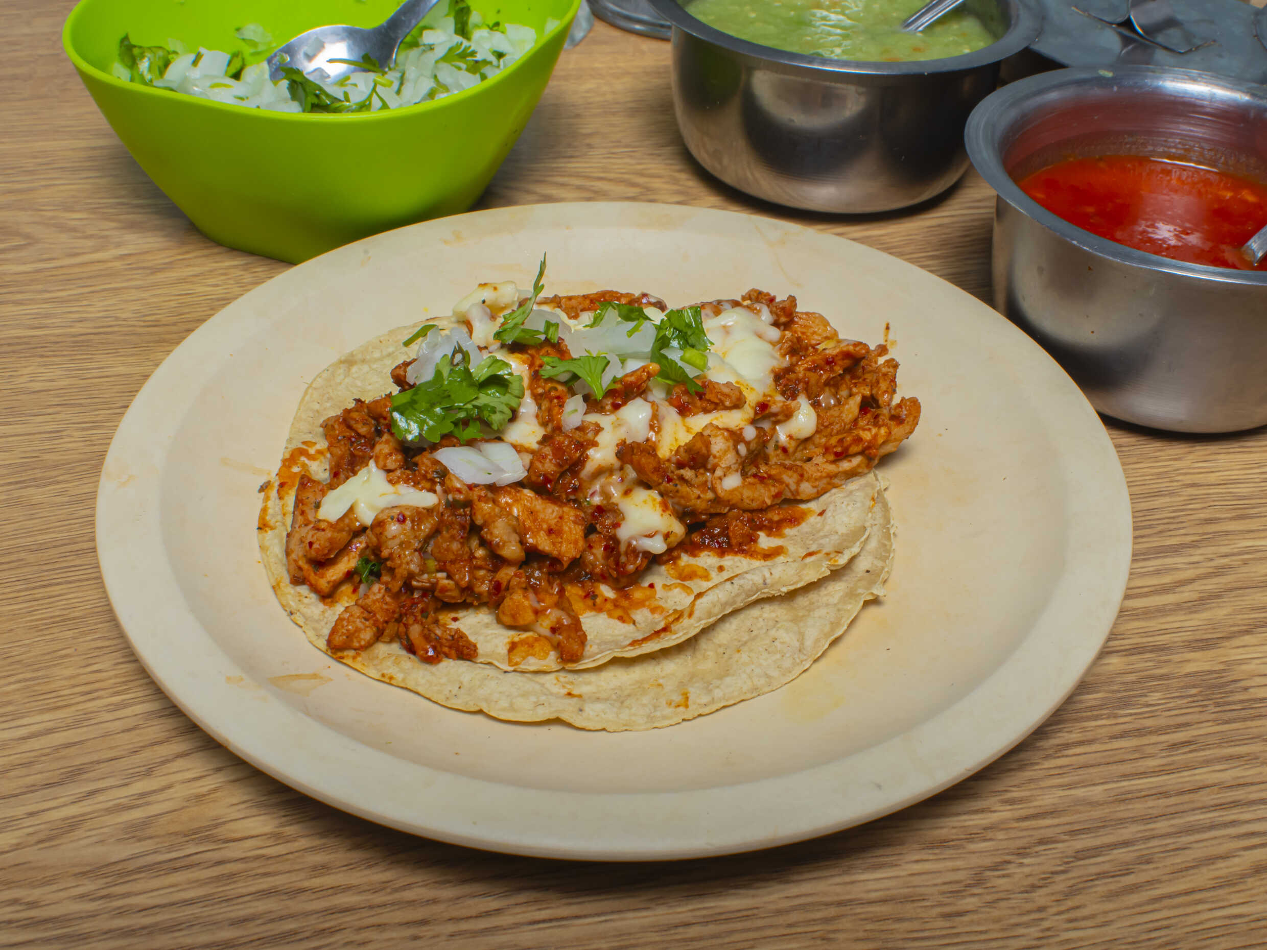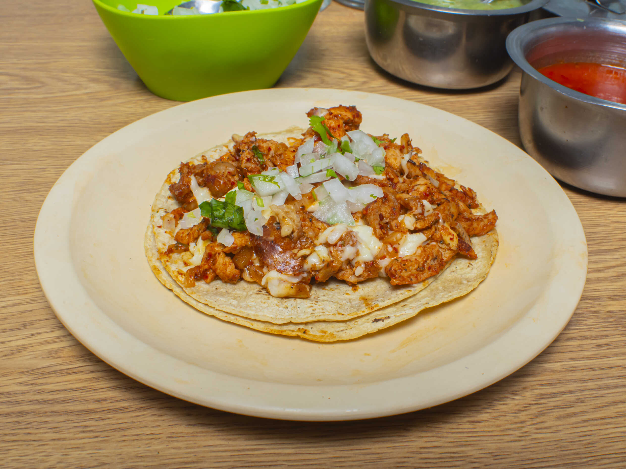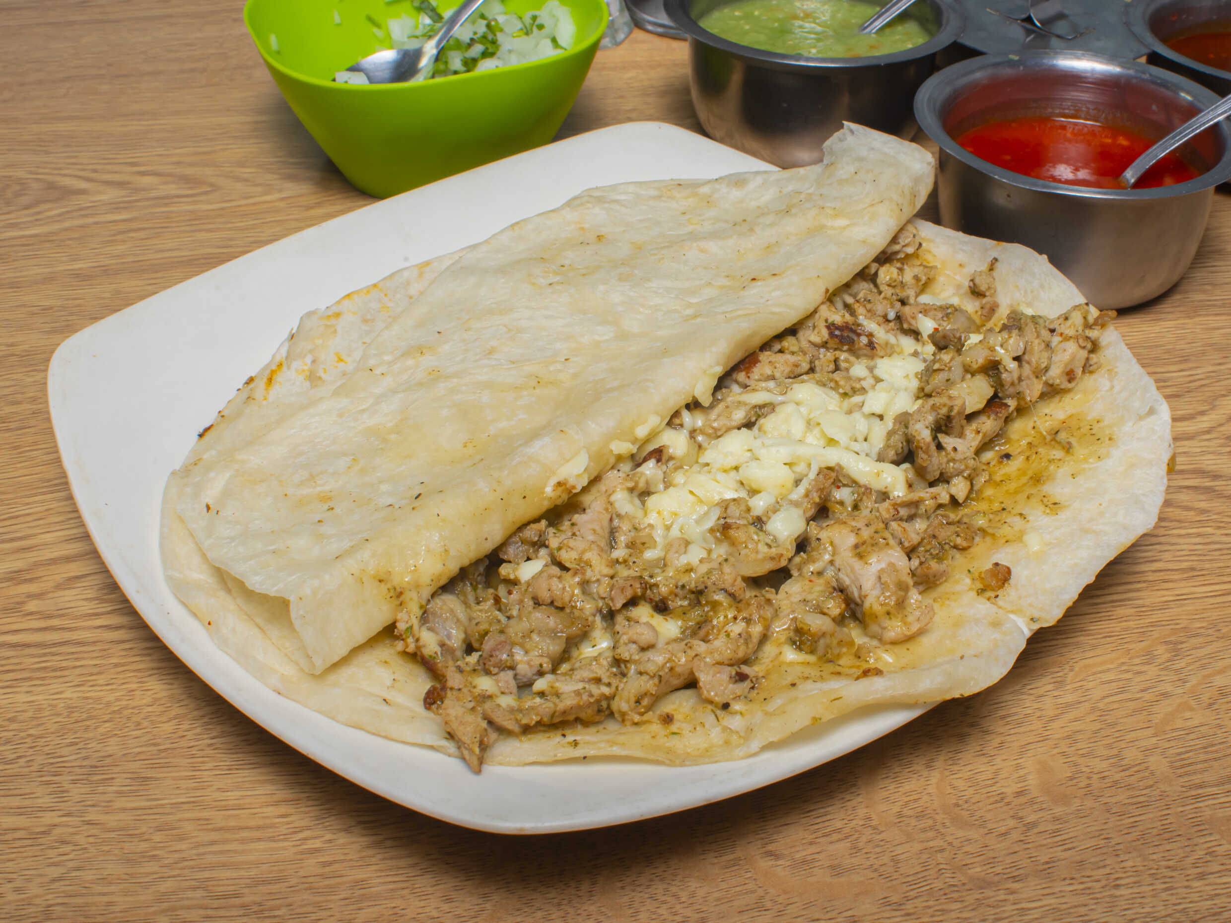 Tortilla de maíz con pollo con queso, acompañados de salsa.
