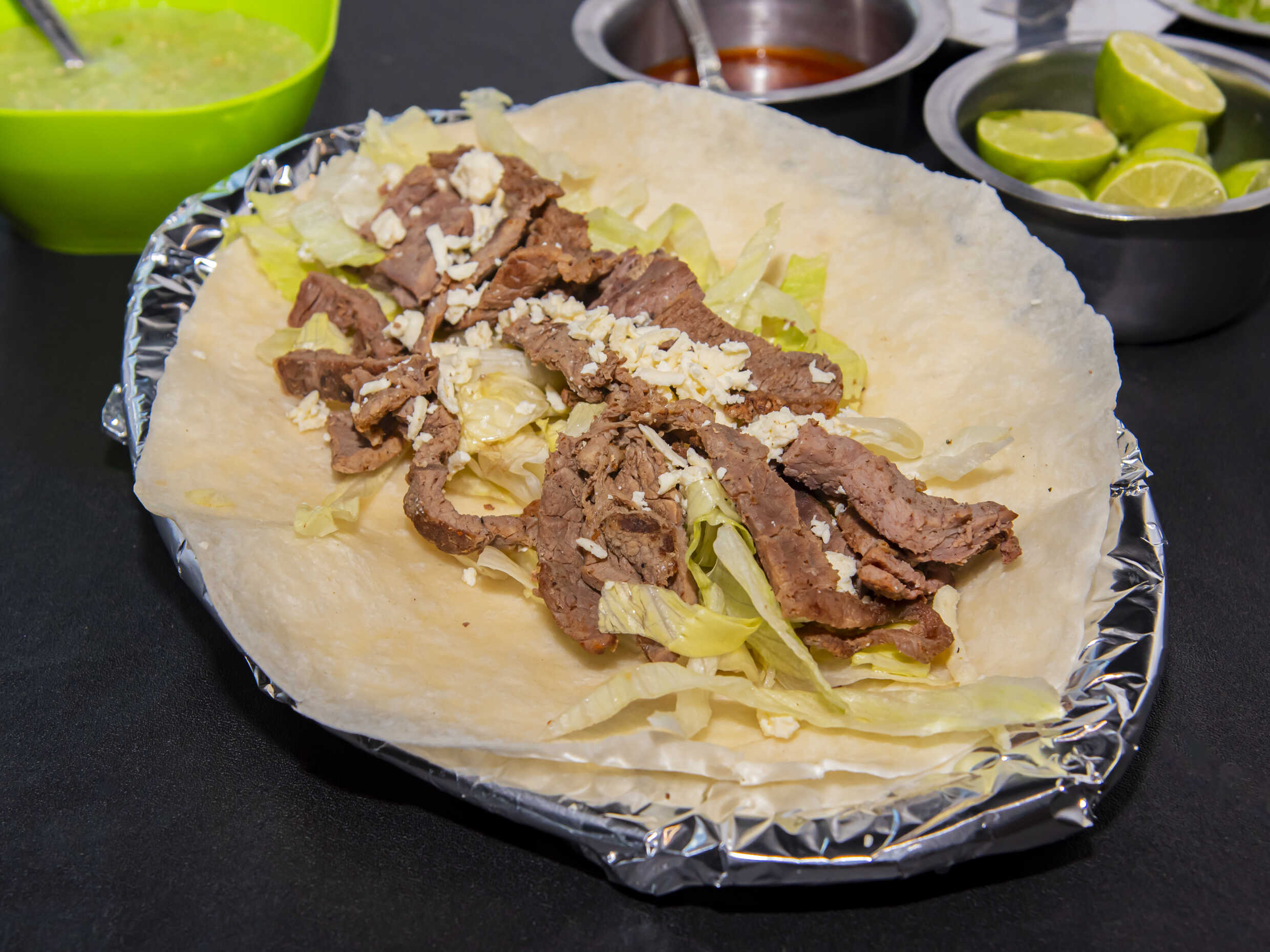 Tortilla de maíz de arrachera, acompañados de salsa.