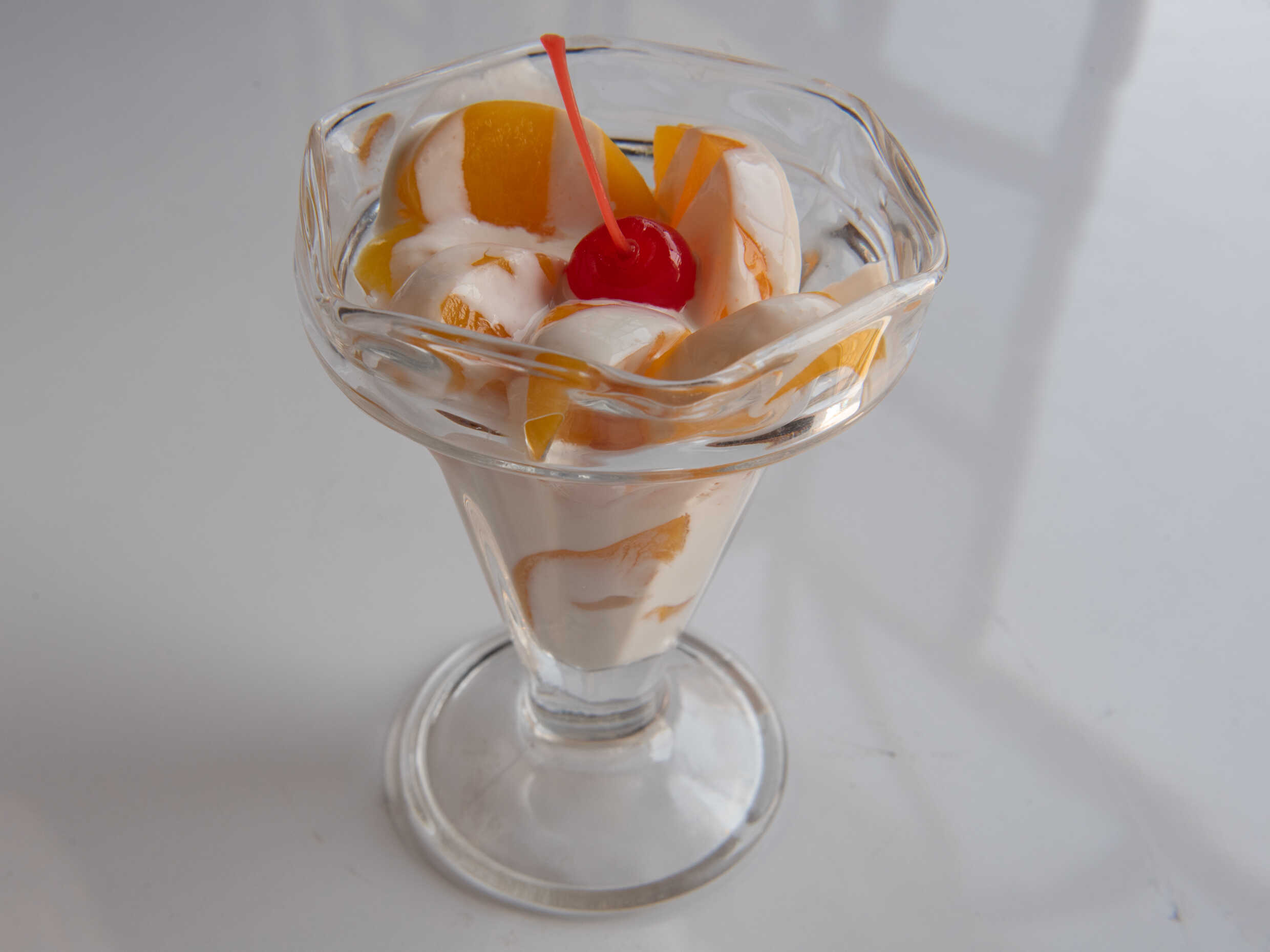 delicisos duraznos preparados con la crema de la casa coronados con cerezas.