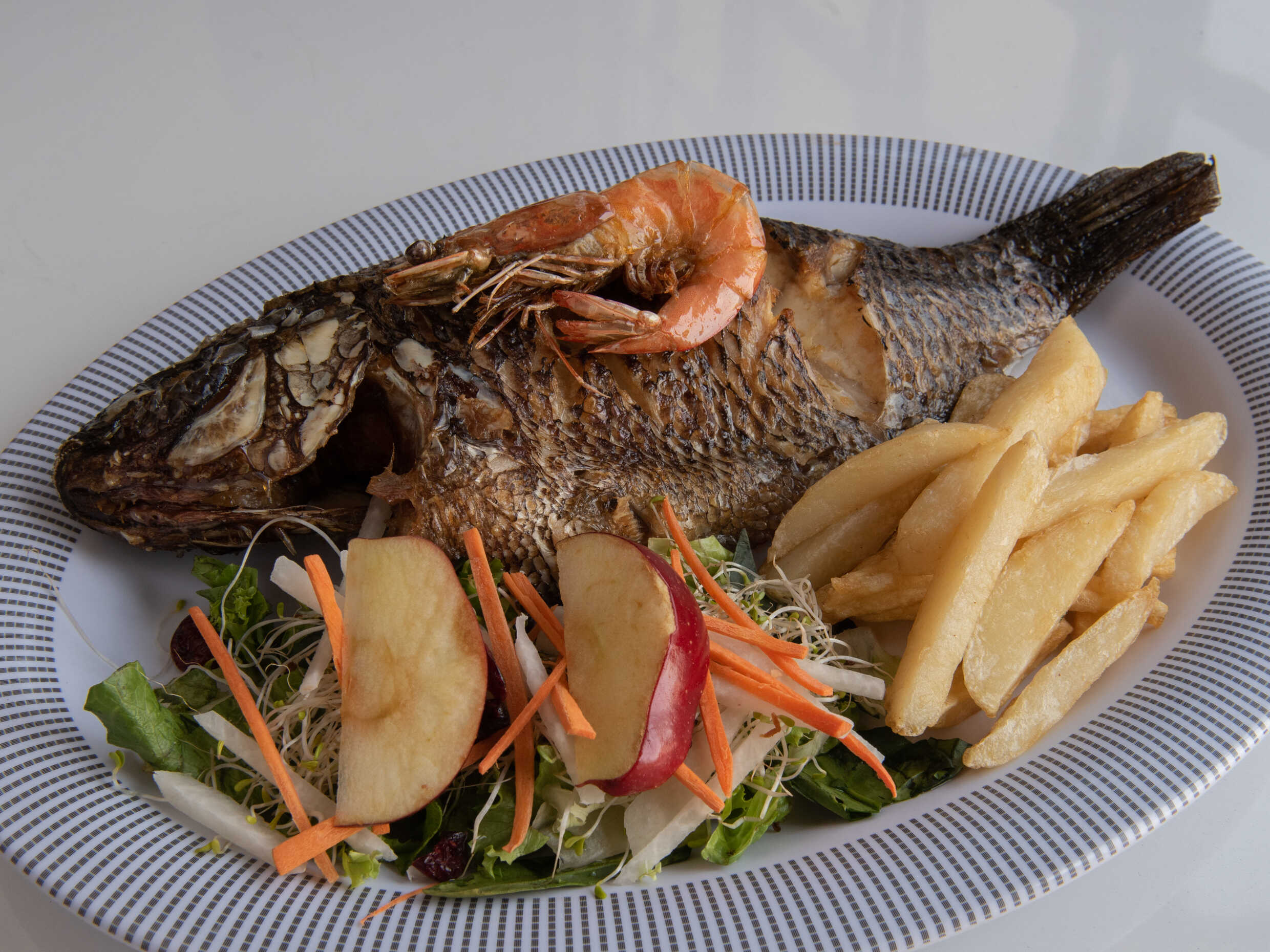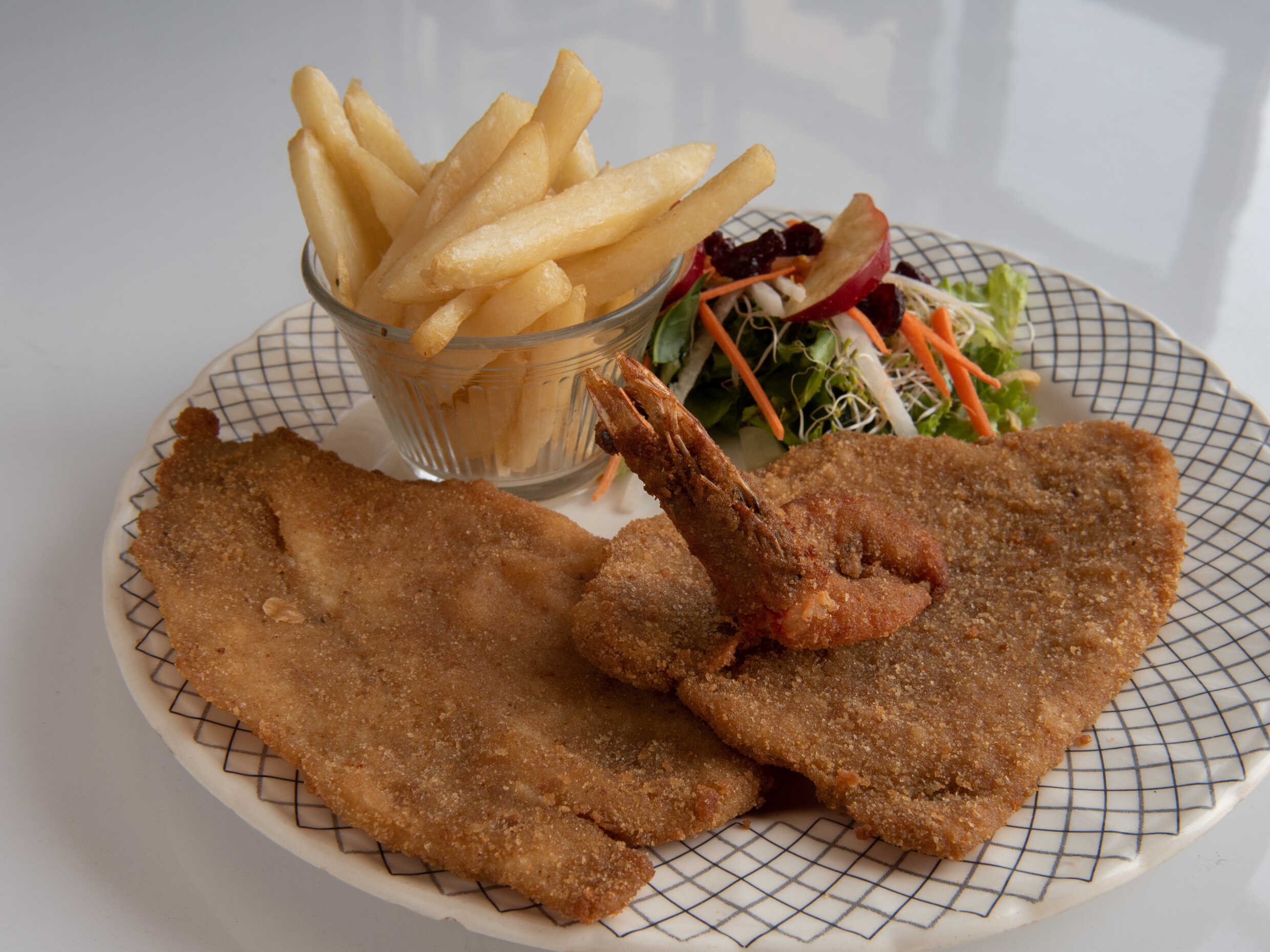 Delicioso feliete capeado con ensalada y papas a lafrancesa.