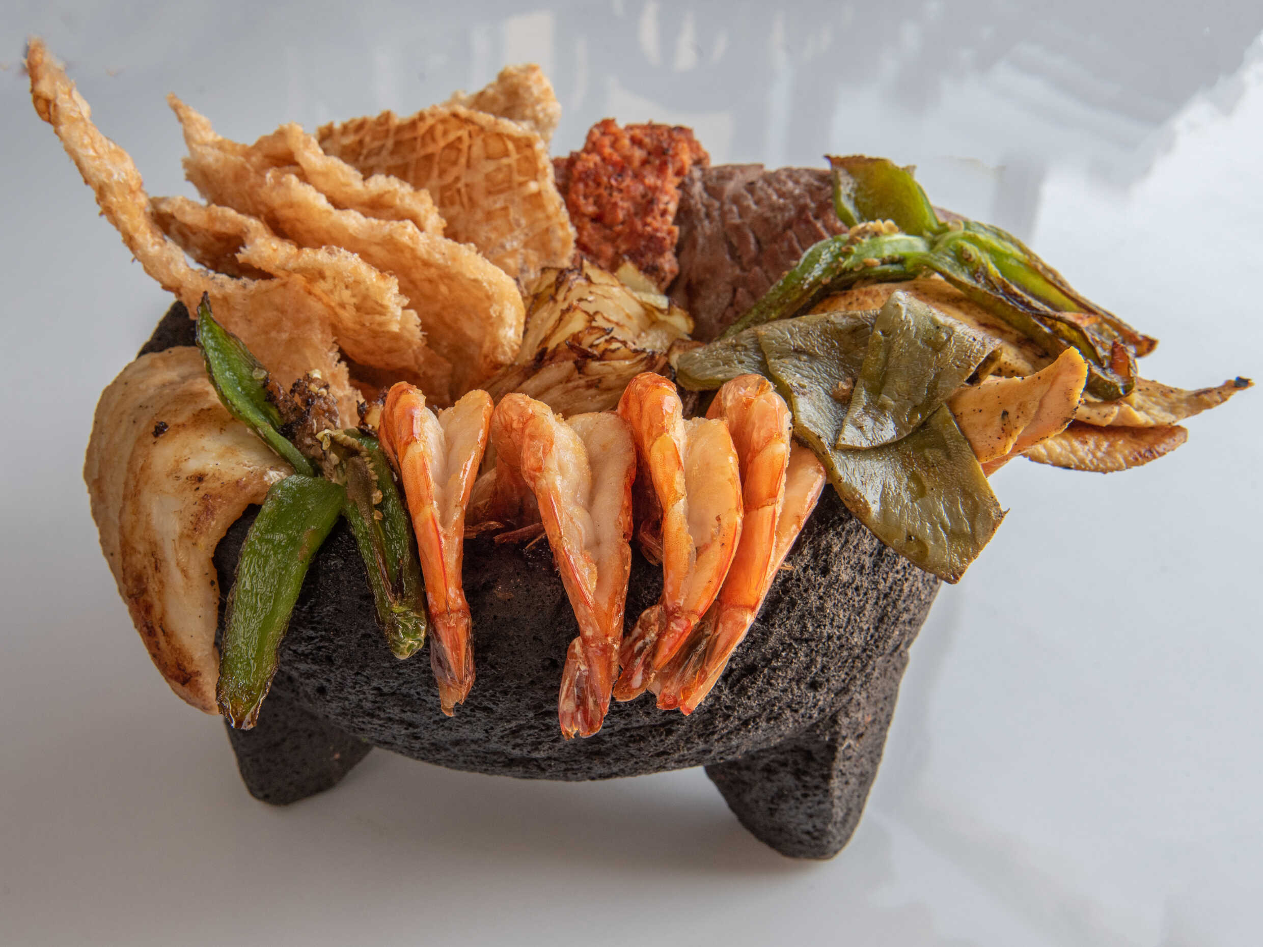 Deliciosa combinacion de mar y tierra con chorizo, camaron, pulpo, chicharron, nopales y queso.